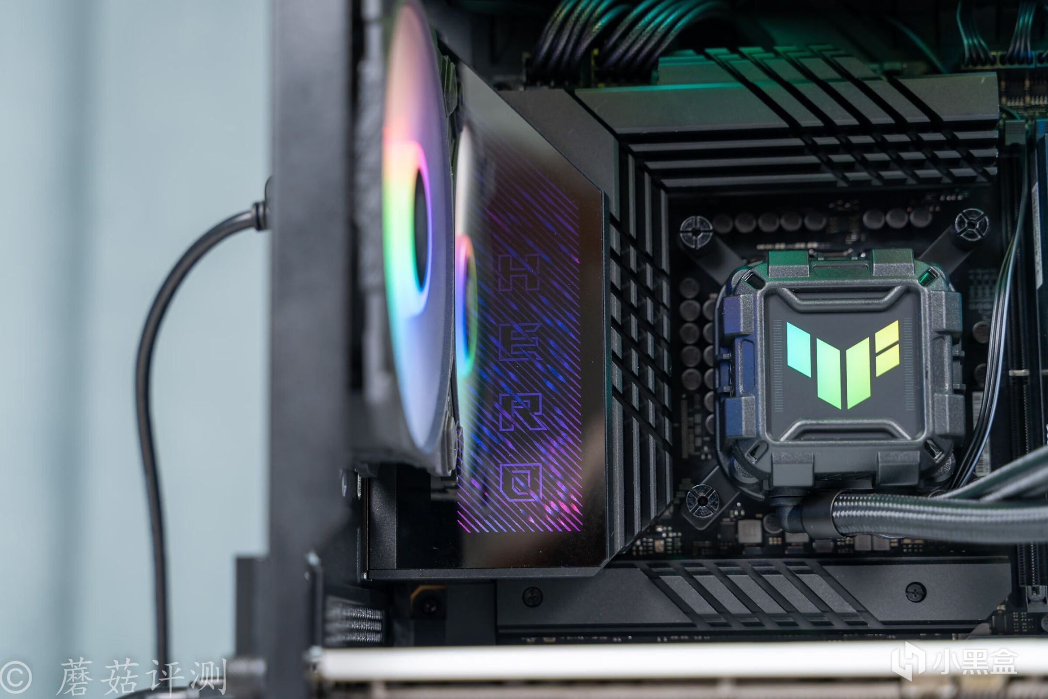 ▼水冷头顶部的TUF的LOGO支持ARGB灯效,柔光效果很不错,颜色很细腻。