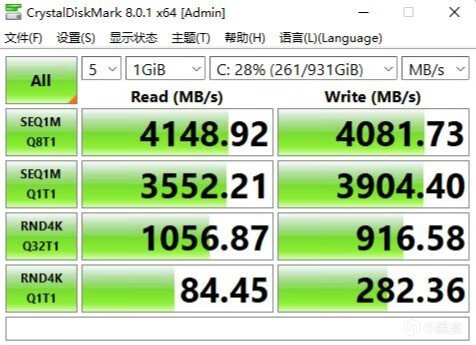 ▼固态硬盘的顺序读取速度4148MB/s、写入4081MB/s,4K读取84MB/s、写入282MB/s,速度表现不错。