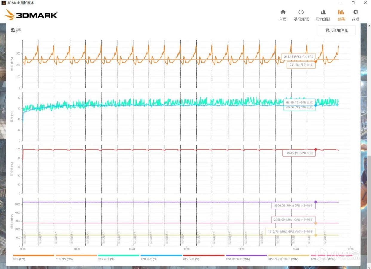 ▼跑个3Dmark的压力测试,TS模式,帧数稳定率在99.6%,非常稳定。