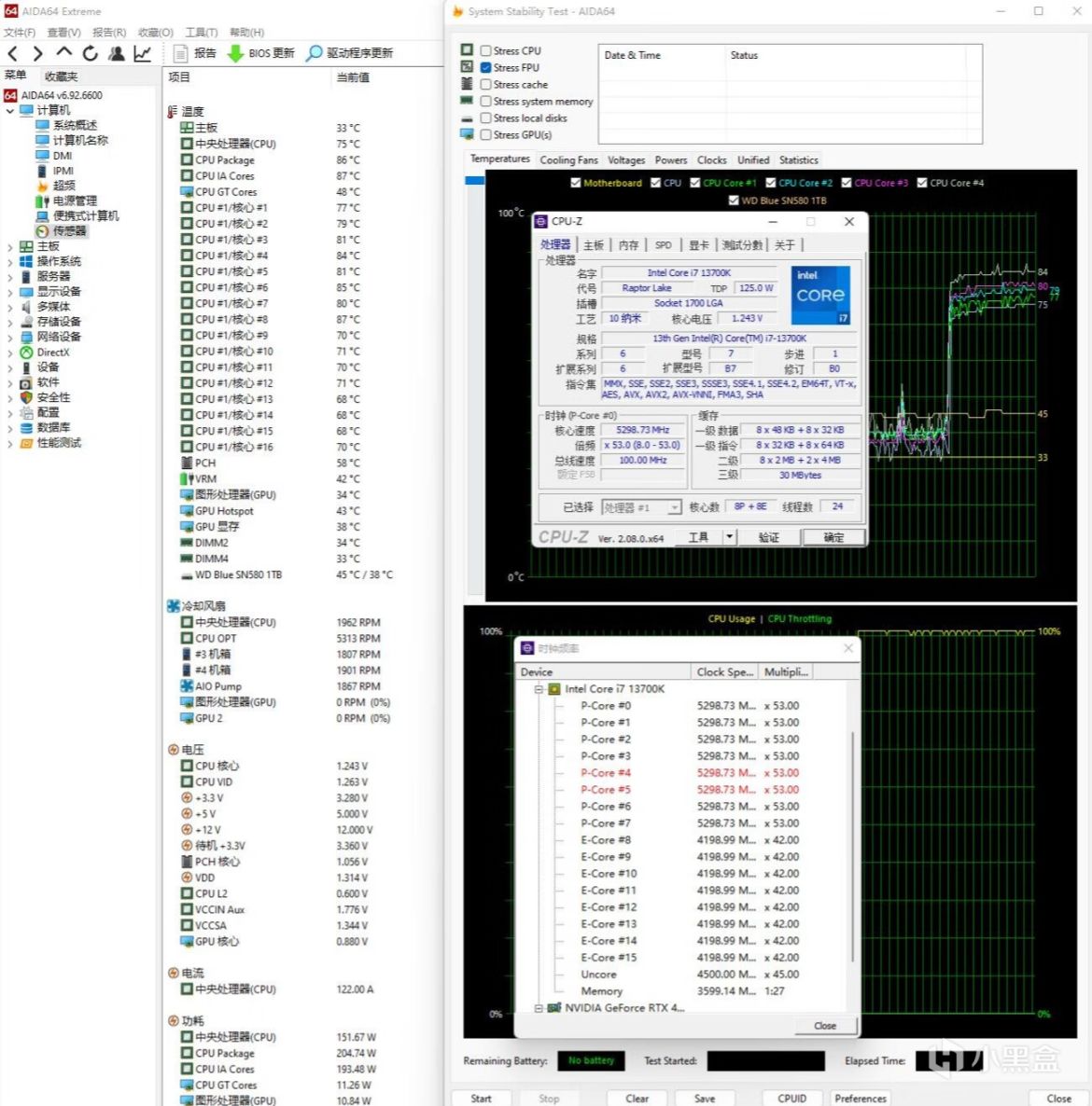 ▼简单跑个CPU-Z的压力测试,处理器温度在75℃左右,大核心6、大核心8温度略高,在85℃、87℃左右,处理器功耗在210W左右,大核心睿频5.3GHz、小核心睿频4.2GHz。