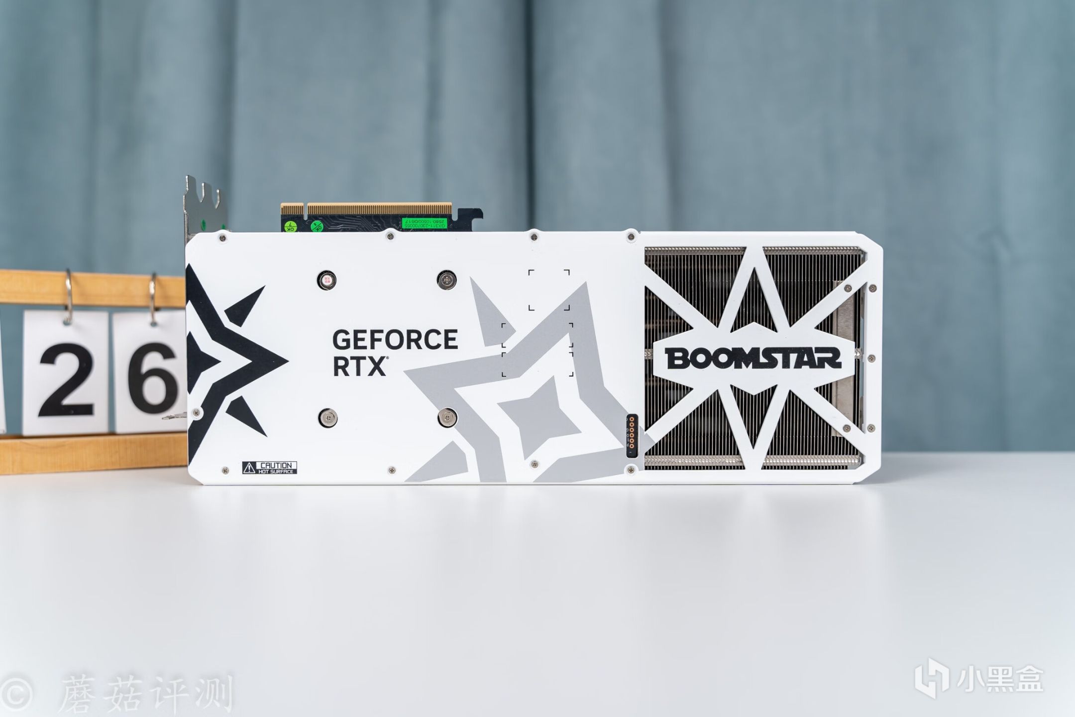 ▼显卡的背面有一大块的金属背板,涂装很赞。右侧是大面积的镂空设计,方便散热风扇吹透散热鳍片,提高散热效率。