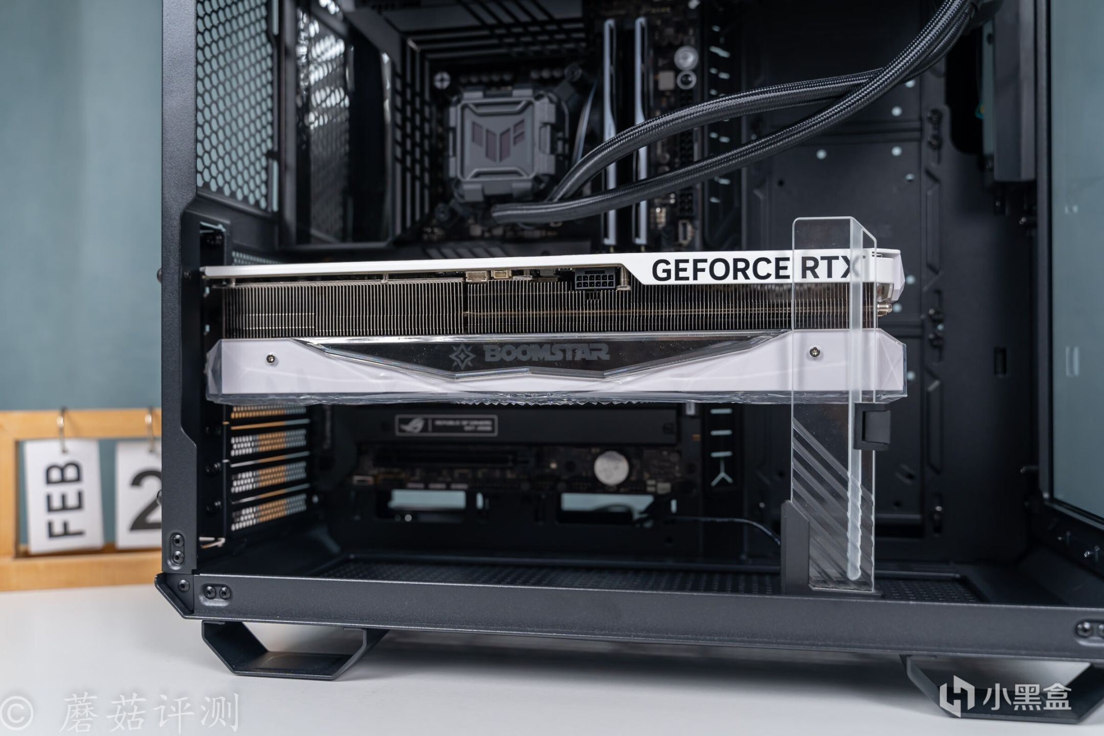 ▼显卡默认水平安装,并在显卡的尾部撑一个显卡支架,让显卡的受力更加合理,保持水平。