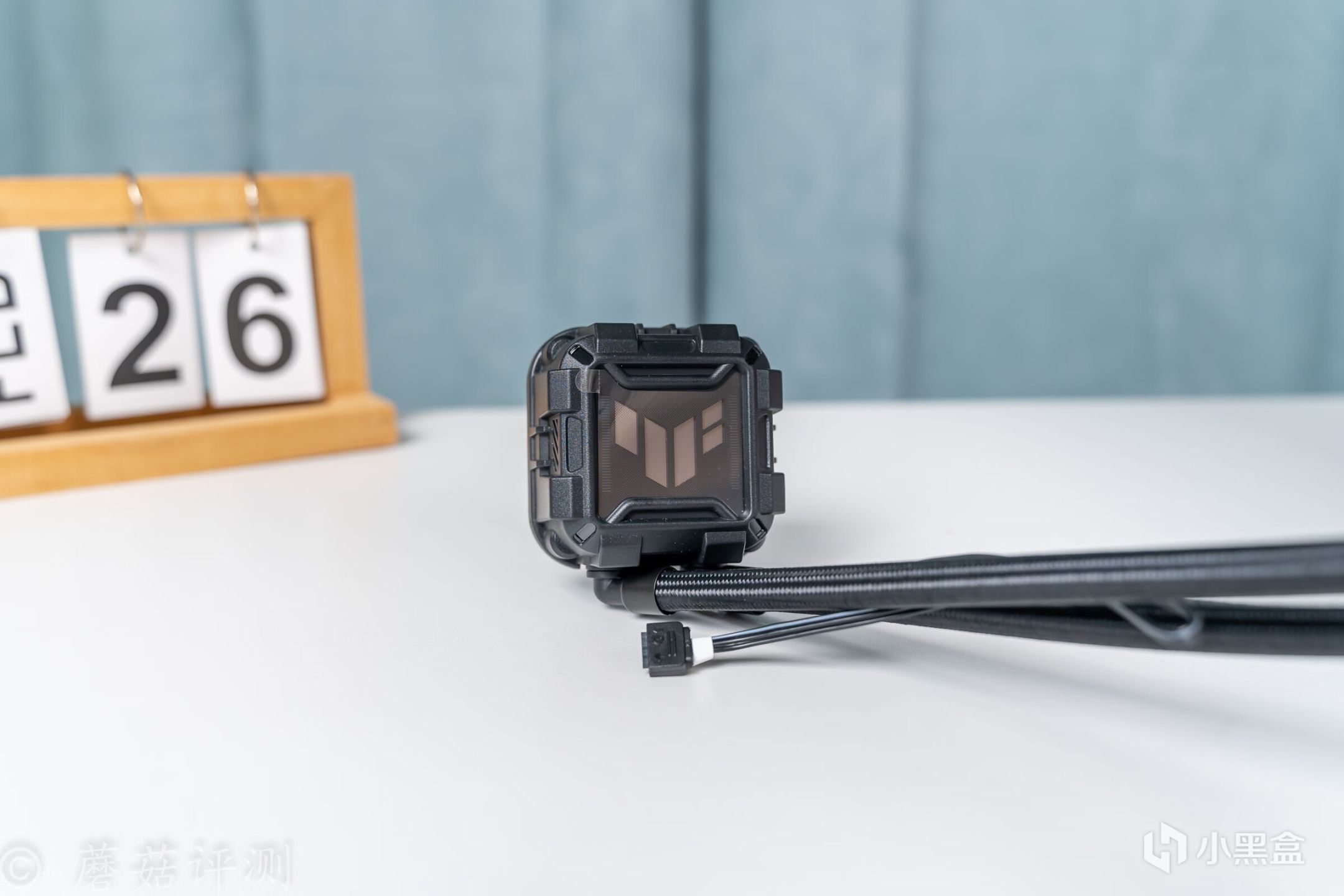 ▼水冷头的造型非常的漂亮,中间部分有一个TUF的LOGO,支持ARGB灯效,四周有一些非常硬朗的外观设计。另外,由于水冷头中的水泵被独立出来了,因此这款水冷的水冷头厚度超薄。