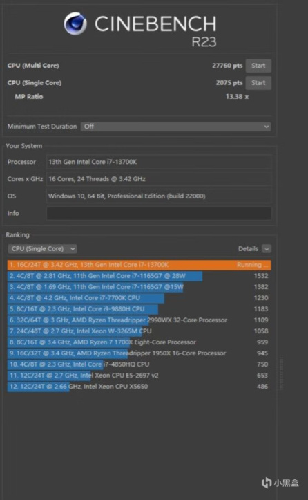 ▼跑个CineBench R23,单线程得分2075,多线程得分27760。