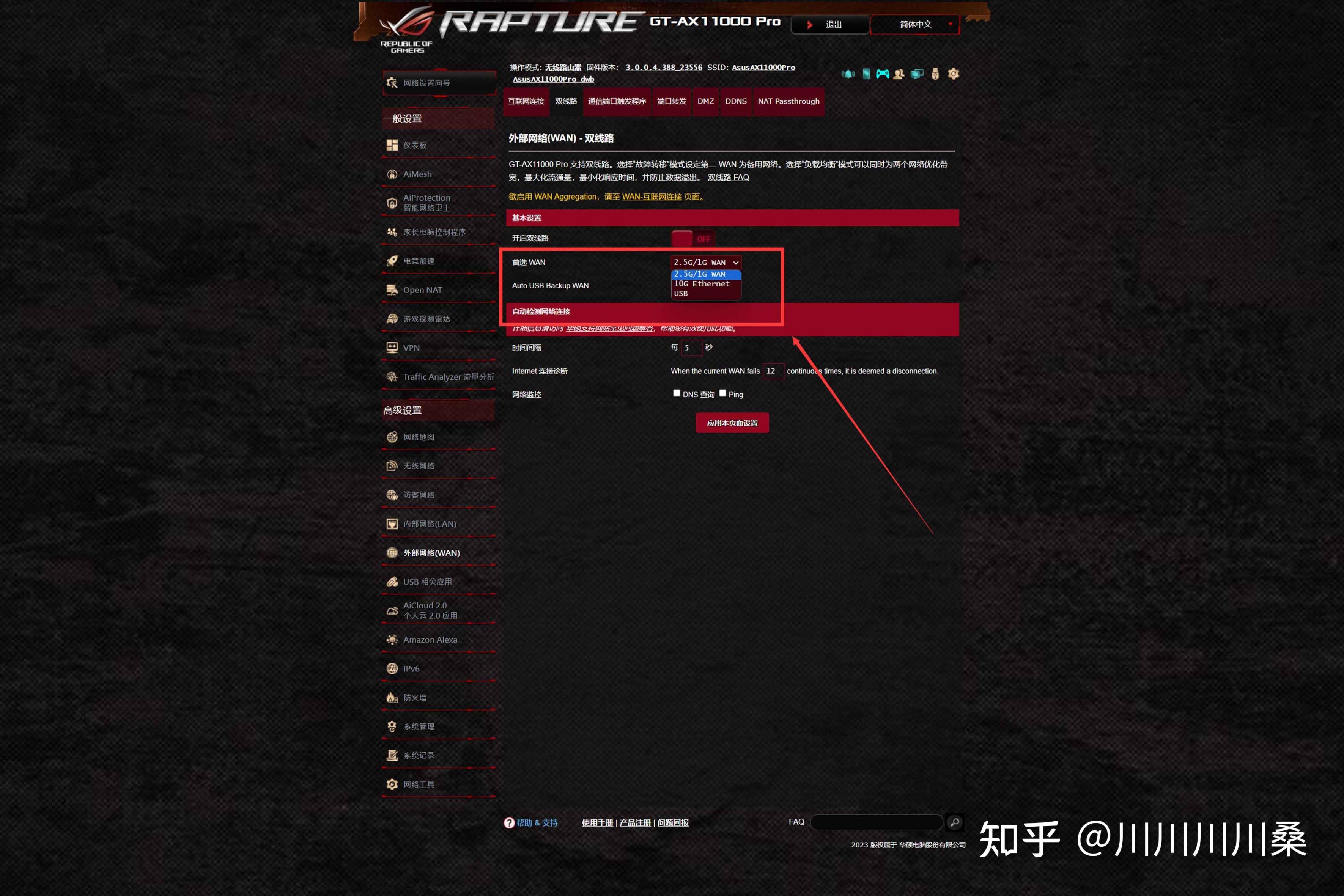 第二是WAN/LAN網口切換,華碩路由器默最大帶寬的網口是WAN,在外部網絡中的雙線路頁面可以切換,將最大帶寬網口配置爲LAN,搭配交換機可以實現更高的內網傳輸速度。