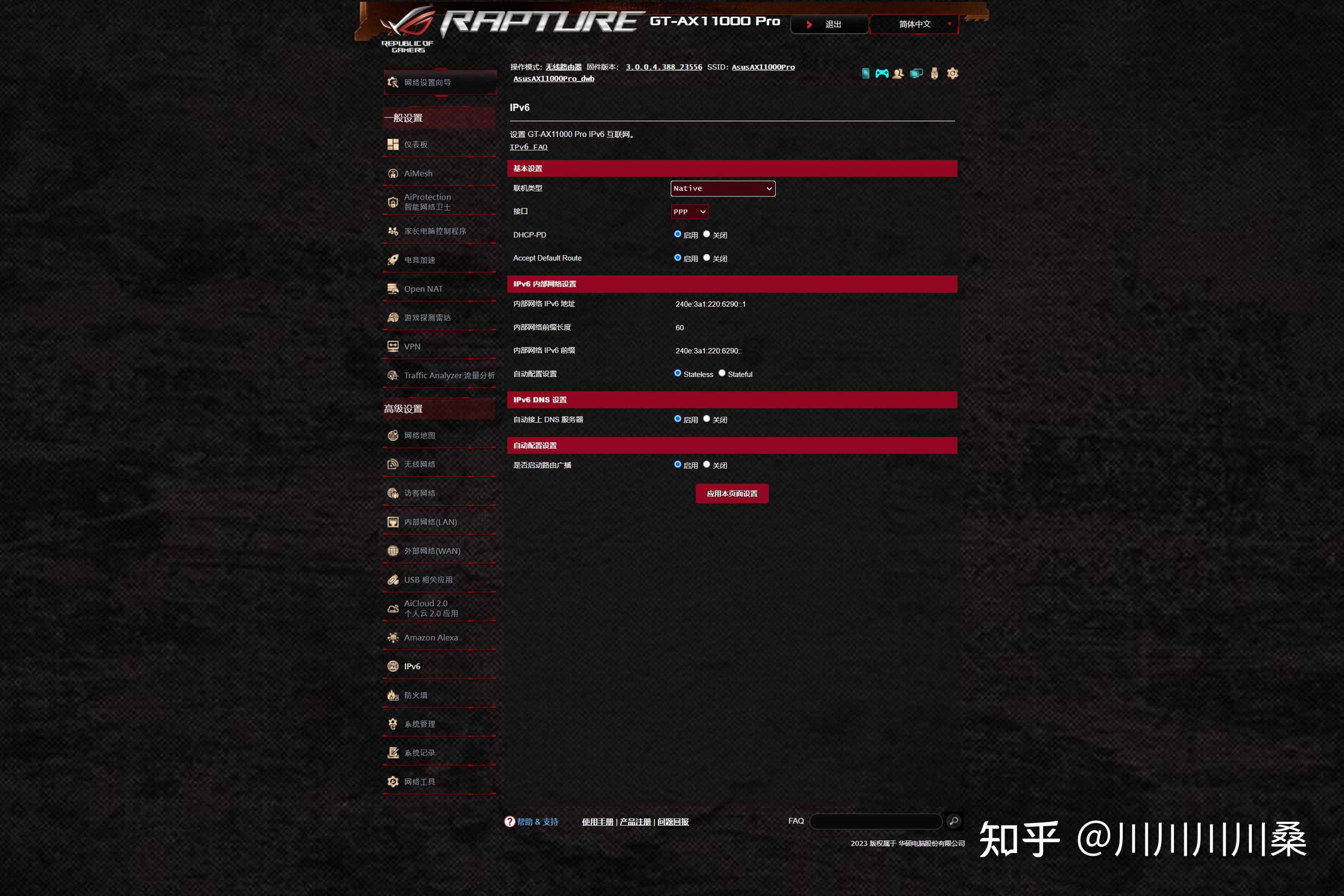 第三是IPv6,目前主流應用都支持IPv4+IPv6雙棧解析,默認IPv6是關閉狀態,需要進入IPv6管理頁面開啓,將聯網類型修改爲Native即可讓所有下聯設備都獲得各自獨立的IPv6協議公網IP。