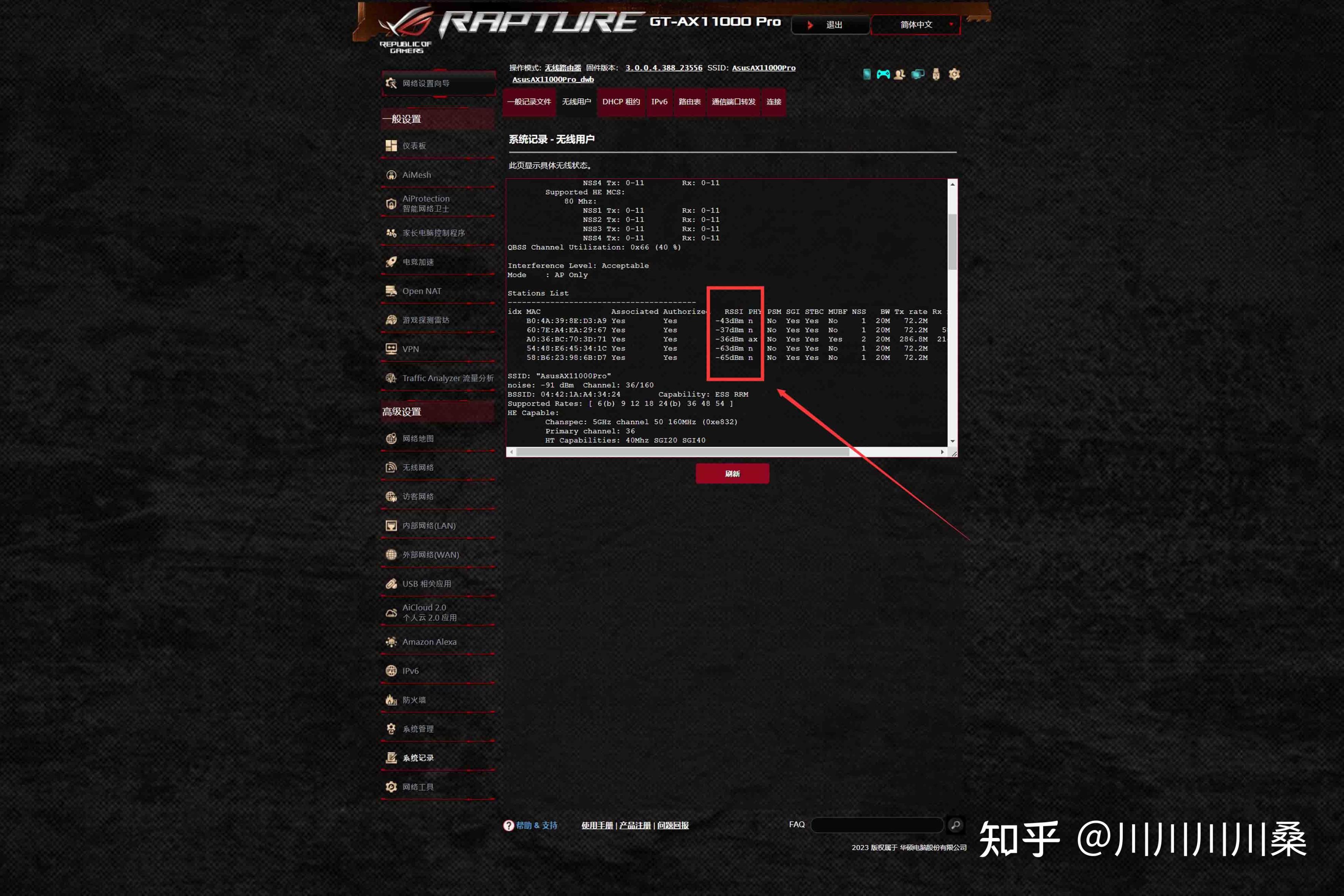 調整後的效果可以通過RSSi值進行量化評估,查看入口在系統記錄中的無線用戶頁面,這裏會顯示各無線設備的連接狀態,圈出來的RSSi值越小越好。