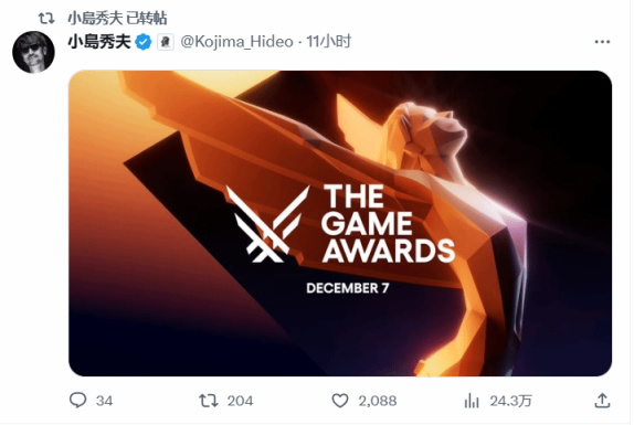 小岛秀夫转发了TGA2023(The Game Awards 2023)的宣传海报,这也让人猜测小岛工作室将参加TGA2023。