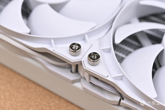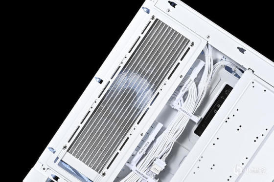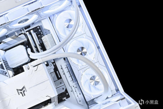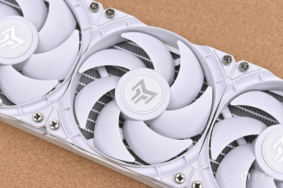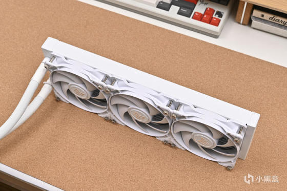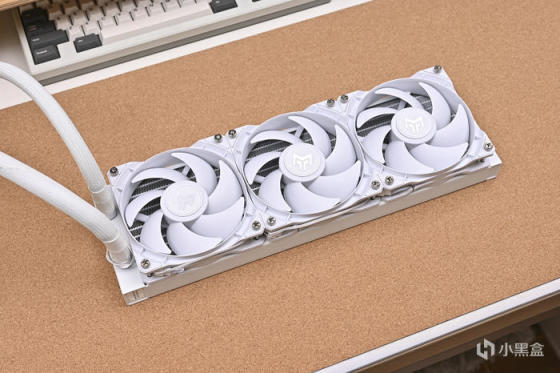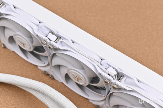 冷排正面标配 3 颗白色 120mm 无光风扇,25mm 标准厚度。冷排为 360 白色铝制冷排,尺寸:394 x119 x59mm,12 条加厚型微水道设计,S 型散热鳍片,有效增加接触面积,更利于热交换效果。
