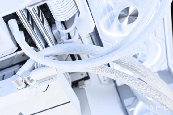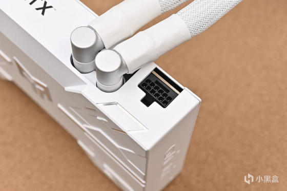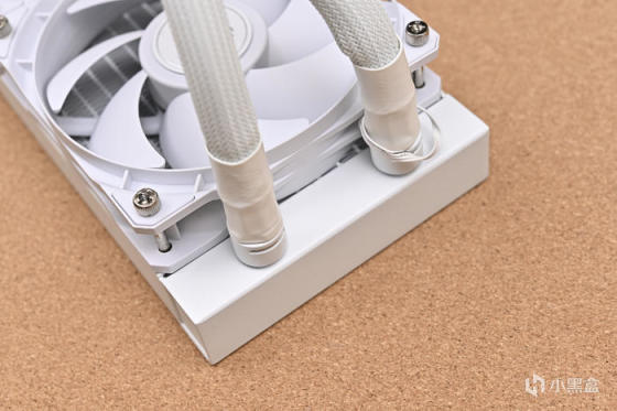 冷排进出水口接头内部采用金属材质,表面外加一层密封,坚固耐用防漏水。风扇线材隐藏于其中一条管道内,起到美化外观的效果。