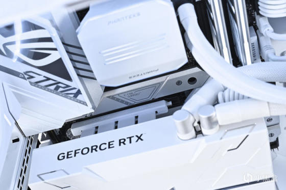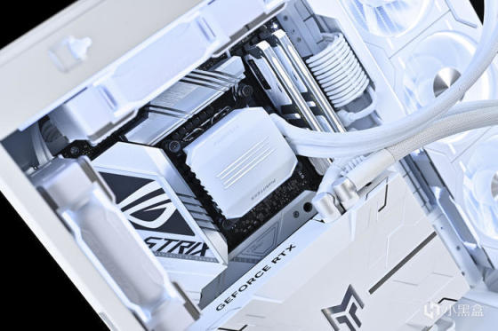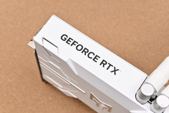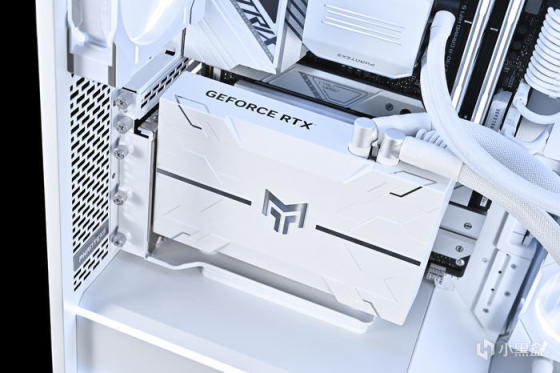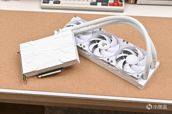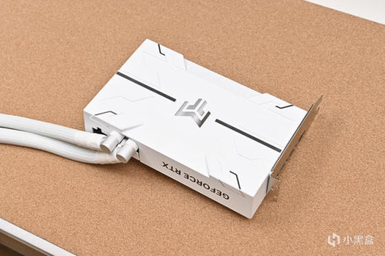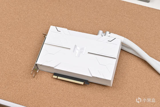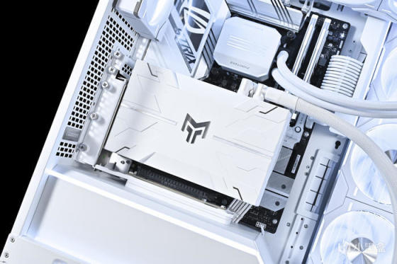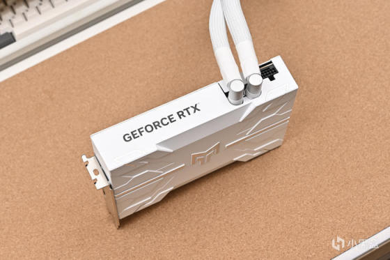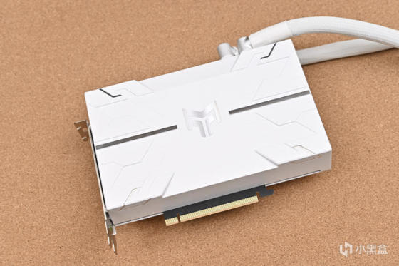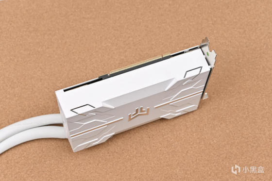 显卡本体采用纯白外观设计,全金属外壳,配合 CNC、喷漆、丝印等工艺,内部集成高转速静音水泵,加强水流动,辅助散热。带有微水道设计镀镍铜底座,配合镀镍热管,通过液体流动高效带走显存和 GPU 热量。