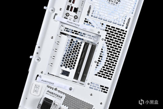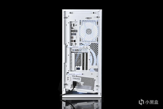 下方为竖装显卡接口,右侧大量通风网孔,辅助散热。左侧分区理线系统的尾部理线区域,配备了魔术贴,让机箱尾部的线材都整齐划一。