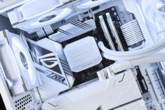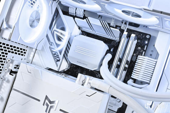 今天带来:无立柱海景房新选择——ROG Z790 吹雪二代+影驰 4090 AIO+追风者 NV5 装机展示。机箱来自追风者 Phanteks NV5,这是追风者继 NV7 全塔 E-ATX 水冷机箱后,最新推出的 中塔 ATX 侧透全视景无立柱海景房机箱,黑白二色可选(本次展示砂纹白色款)。整机尺寸:239 x477 x528mm,整机采用 0.8mm 钢架结构、1mm 加固件,结构坚固,做工扎实,模块化设计拆装方便。正面和侧面 4mm 厚高透钢化玻璃 90 度拼合,视觉观感非常清透,可全方位硬件、灯效展示。机箱其他面板大面积开孔,底部斜向抬高设计,立体风道增强进风。兼容性方面,内部空间宽阔,主板支持最大 E-ATX(305 x280mm),显卡最大长度 440mm,塔式风冷最大高度 180mm,机箱顶部、侧部可同时安装 2 个 360mm 冷排,整机还可安装 8 颗 120mm 风扇。存储方面,支持 3 个 3.5 寸硬盘、4 个 2.5 寸 SSD。此外 ARGB 动感光效控制、分区便捷理线、显卡多功能支架也都可圈可点。这款机箱由于下部只有一个风扇位,建议侧面风扇为进风,顶部和尾部出风,四进四出,可获得最佳散热效能。CPU 采用英特尔最新的酷睿 i7-14700K,能效核从原来的 8 个升级到了 12 个,线程数也增加到了 28 条,L3 和 L2 级缓存也分别增加到了 33MB 和 28MB,参数上与上一代 i9-13900K 无限接近。英特尔通过和软件厂商的合作,结合酷睿 14 代,可以更好的利用线程调度器来优化游戏,另一个升级就是基于 AI 计算带来的全新 XTU 超频功能,最新版的 XTU 中增加了对酷睿 14 代来带的 AI 超频技术,通过 AI 模型训练,XTU 可分析每一台电脑特性,针对性进行超频,同时 AI 本地计算能力的提升,也为更多桌面端 AI 模型计算能力带来了显著提升;搭配机箱主板选择了 ROG STRIX Z790-A GAMING WIFI S 吹雪二代,拥有 16(70A)+1(70A)+2 相供电模组,单颗可承载 70A 电流,完全满足 14/13/12 代旗舰级 CPU 使用,内存可支持超频至DDR5-8000MHz(OC+),搭配 AEMP 2.0,DIMM Flex 等功能让超频更稳定轻松,还加入了最新的 WiFi7,银白色装甲风格也非常适合白色装机使用。