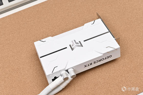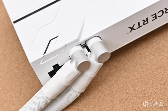 显卡供电接口位于显卡侧面末端,为全新12VHPWR 供电接口,支持 PCI-E5.0规范,单口可达 600W。附送了 12VHPWR 转 4x 8Pin 供电线。