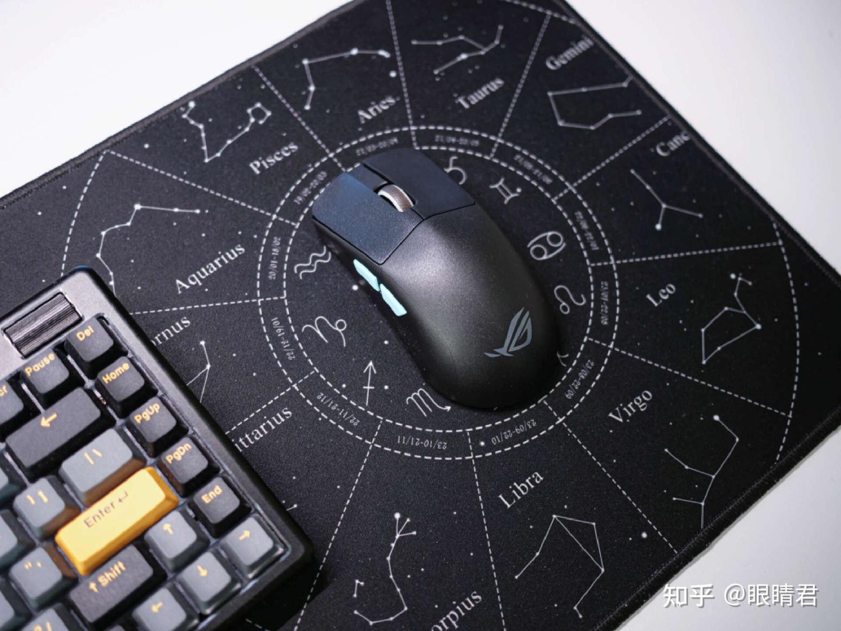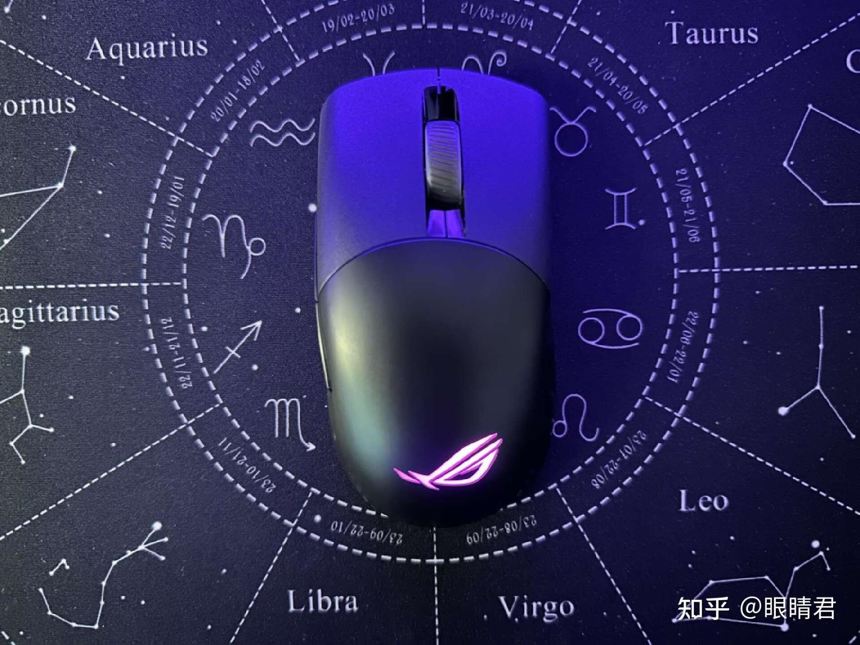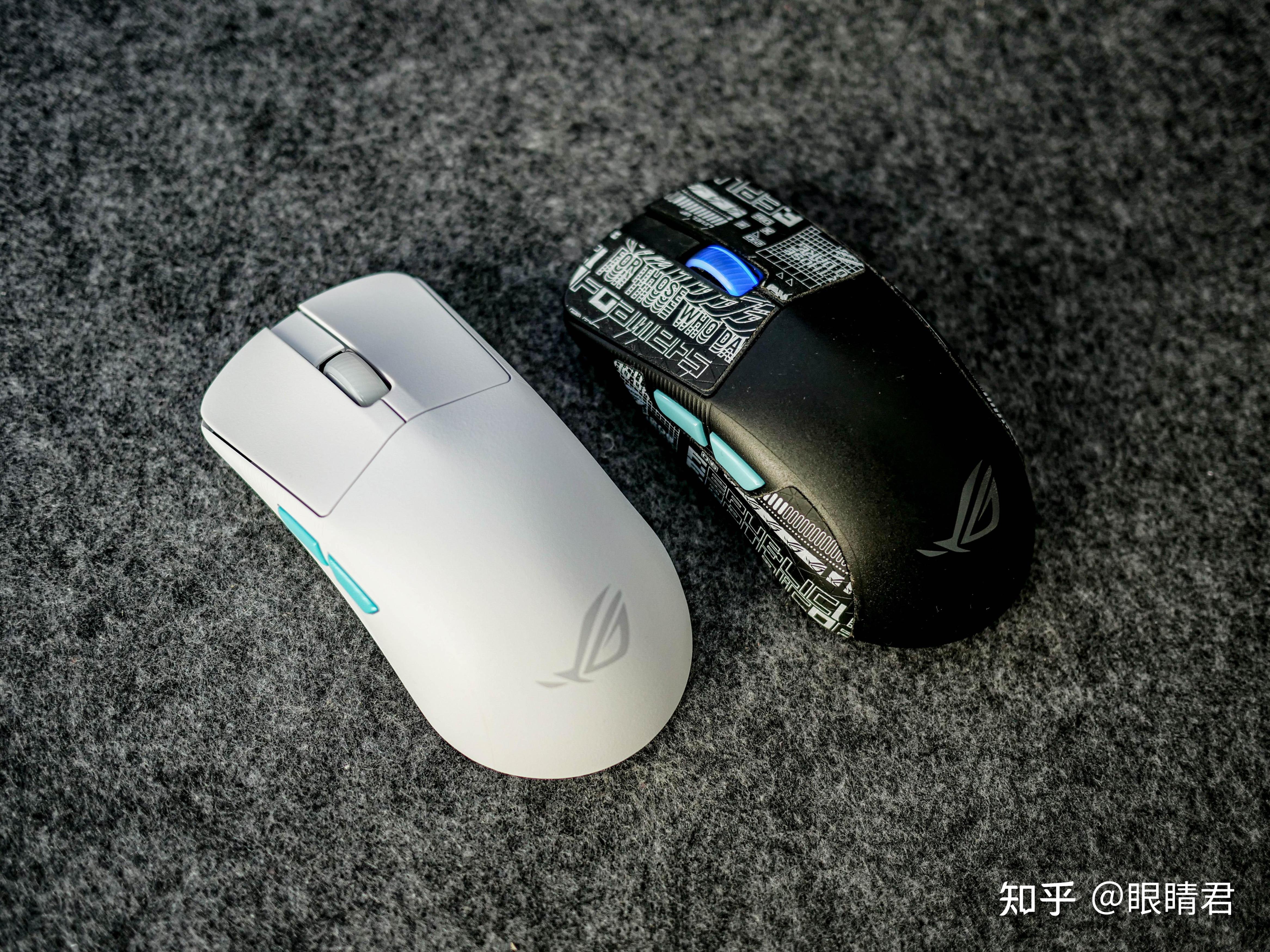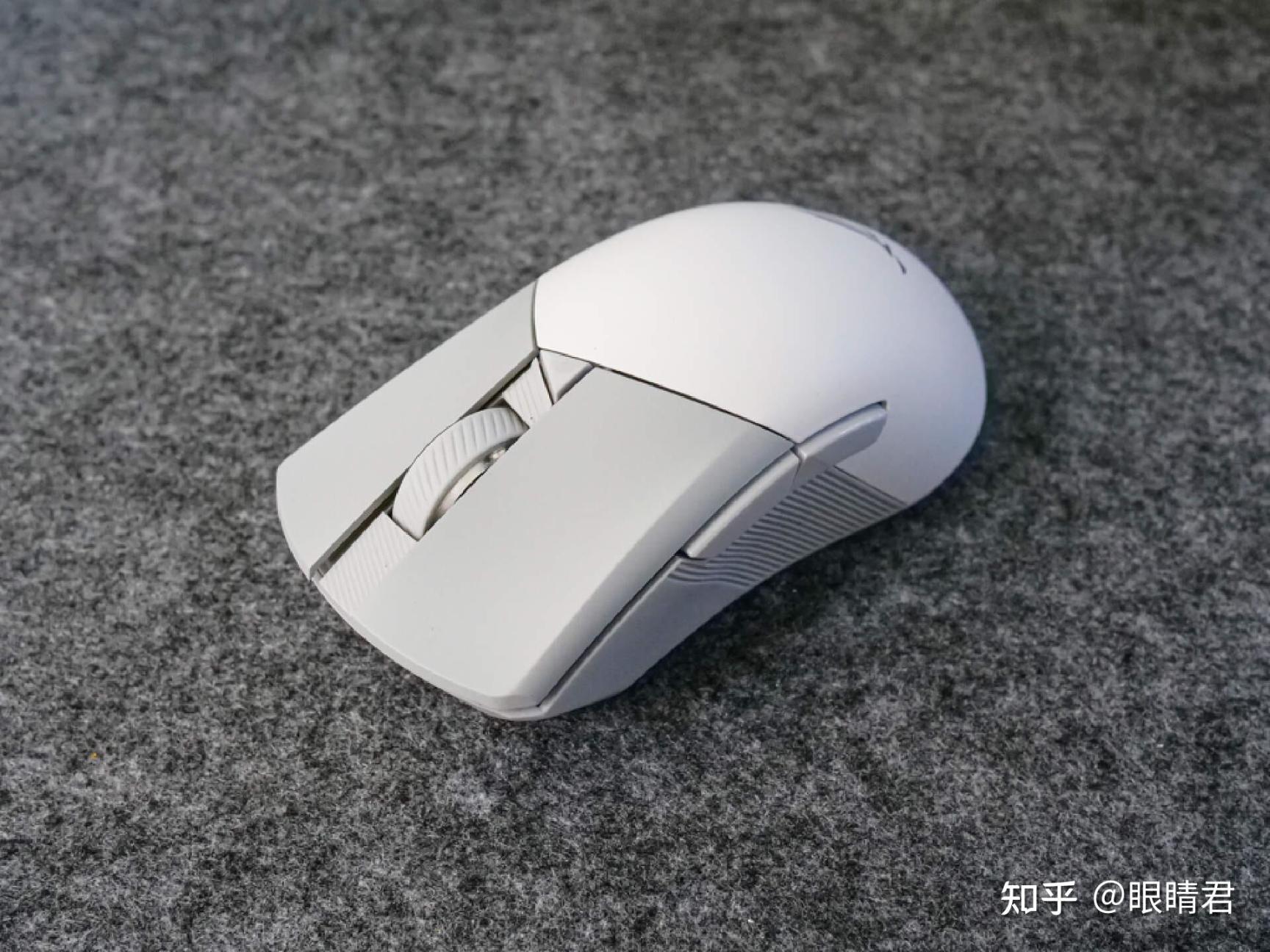 目前个人在用款,54g轻量化设计,127.5mm*63.7mm*39.6mm的尺寸,对称式设计,我中等手掌从GPW换过来基本没有不适感,趴握使用下按键部位跟手指更贴合,搭配ROG鼠标标配的图腾贴纸,手感要更好一些。