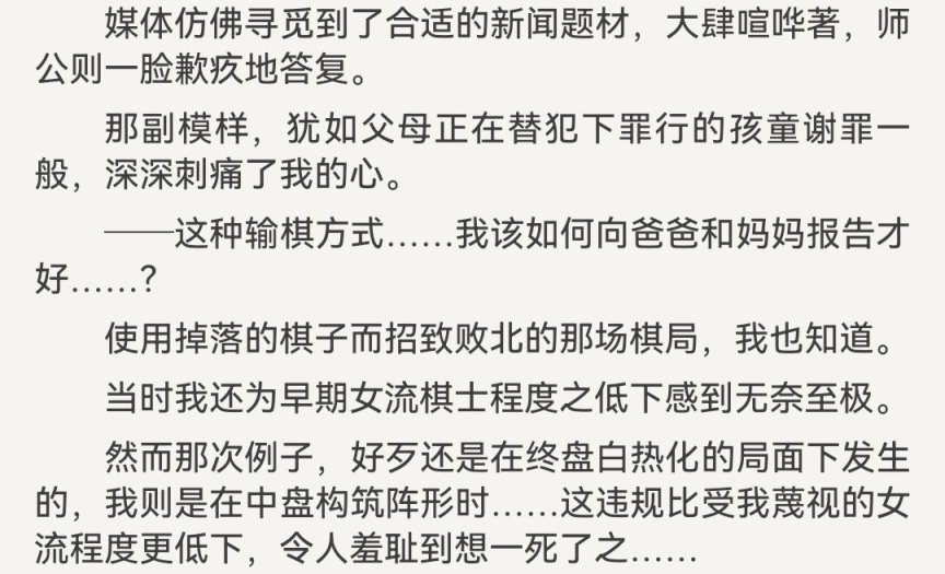 天衣滿腔憤懣卻無法言語,反倒是屈辱的感覺更多。因爲她對人對己要求都非常嚴格,不久前還在感慨一則新聞,女流棋士因爲違規敗北。天衣認爲這種情況錯在沒有約束自己的對局者。