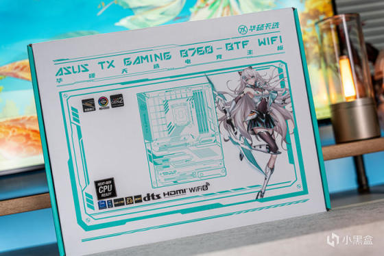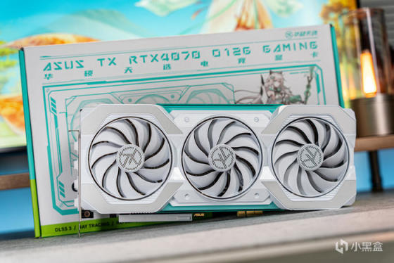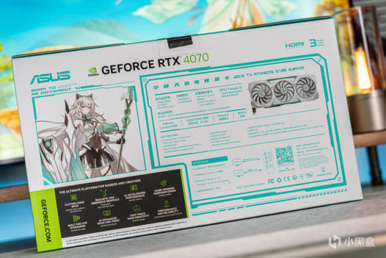 華碩 TX RTX4070 O12G BTF GAMING主板的包裝,天選姬與顯卡圖案以及英偉達4070的中置顯眼,頂部則是其顯卡的型號,中間標註了OC 版本 12G GDDR6X顯存,以及PCIE4.0和DIRECT X 12支持,底部還有英偉達的DLSS3、RAY TRACING 、REFLEX、STUDIO的特性支持