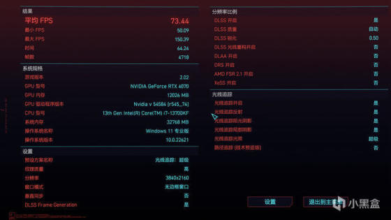 2077在4KP分辨率超級光線追蹤特效下開啓幀生成的DLSS3測試平均73.44FPS