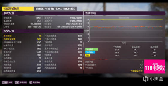 地平線5在4K分辨率在極端特效下開啓幀生成的DLSS測試平均118PS