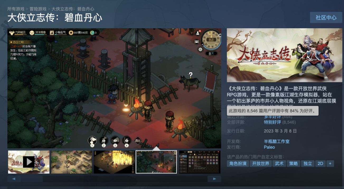由“醋仙”——半瓶神仙醋开发的独立游戏《大侠立志传:碧血丹心》曾在今年3月开启了EA抢先体验。在经过了8个月的更新和制作后,工作室终于宣布将会在11月16日发布游戏的V1.0正式版。
