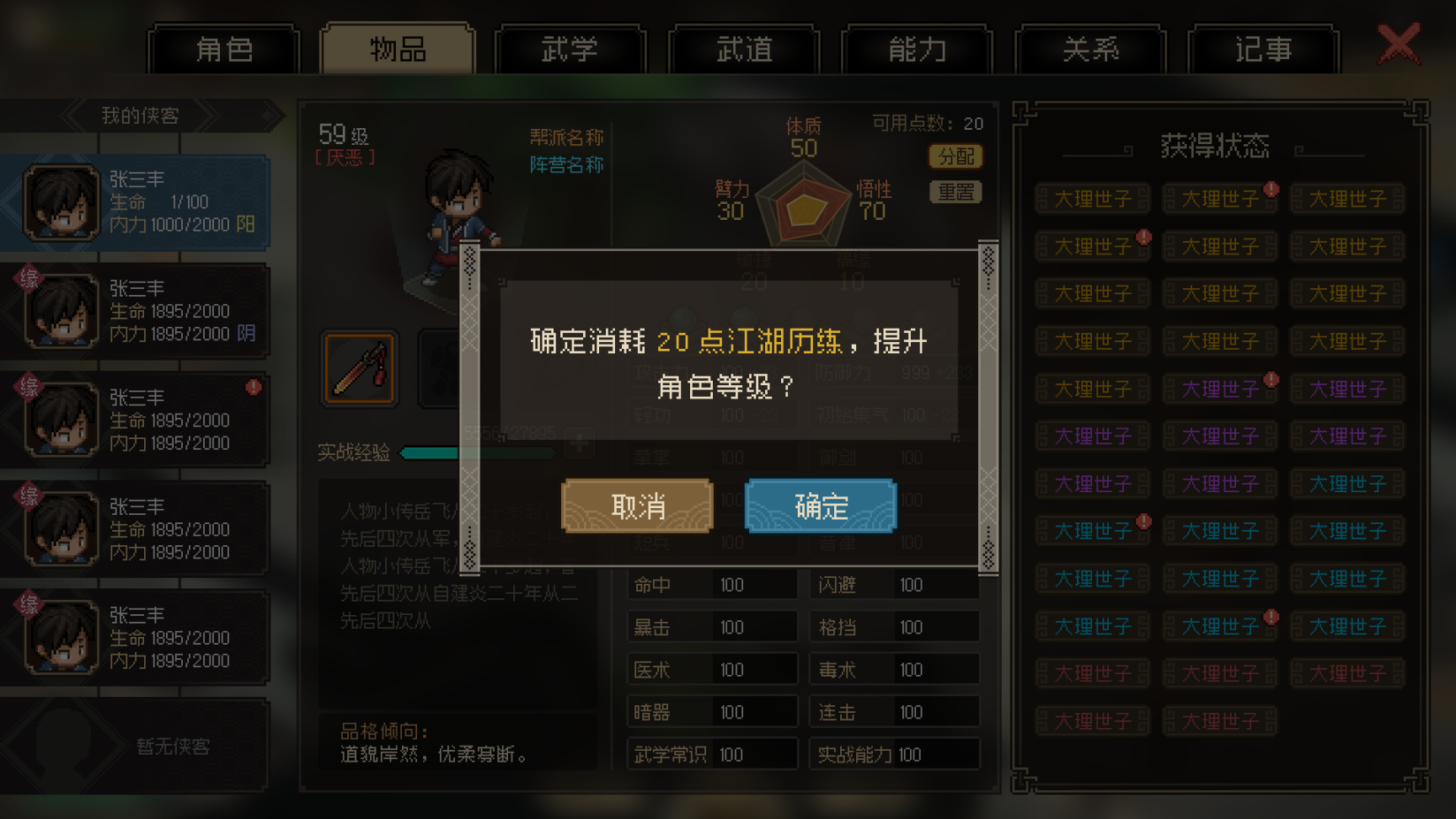 完成江湖事件后,玩家可以通过“江湖历练”功能为团队储存“经验池”,根据自己的想法分配角色经验和升级武功。游戏中所有具备江湖地位的NPC,均可以进行挑战,通过挑战可以获取相应的名声与经验。