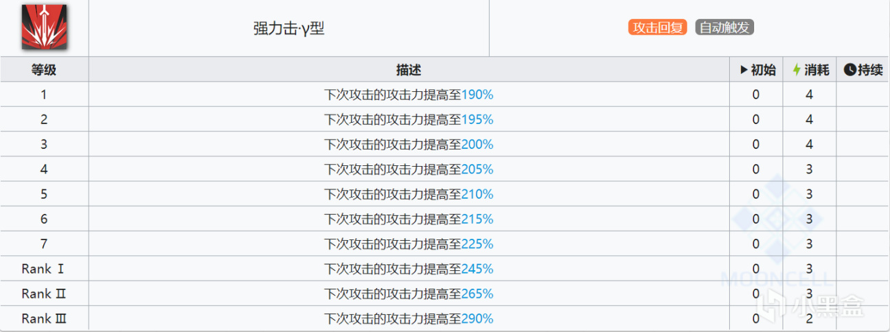 這是一個非常典型的盾前/盾側類掛機技能,專三收益很高,從三刀一次暴擊變爲兩刀一次暴擊,在三級模組且專三的情況下,每次強力擊傷害高達4792點,破甲線非常高,比赫德雷的1技能(4736點)還要猛。
