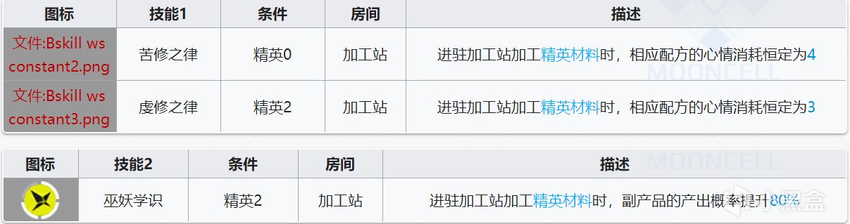 止頌的基建能力比較強,精二後在加工站能有不錯的發揮,可以提升精英材料的80%副產品出率(和錫蘭是一個級別),但是他的特色在於所有精英材料的心情消耗都是3。