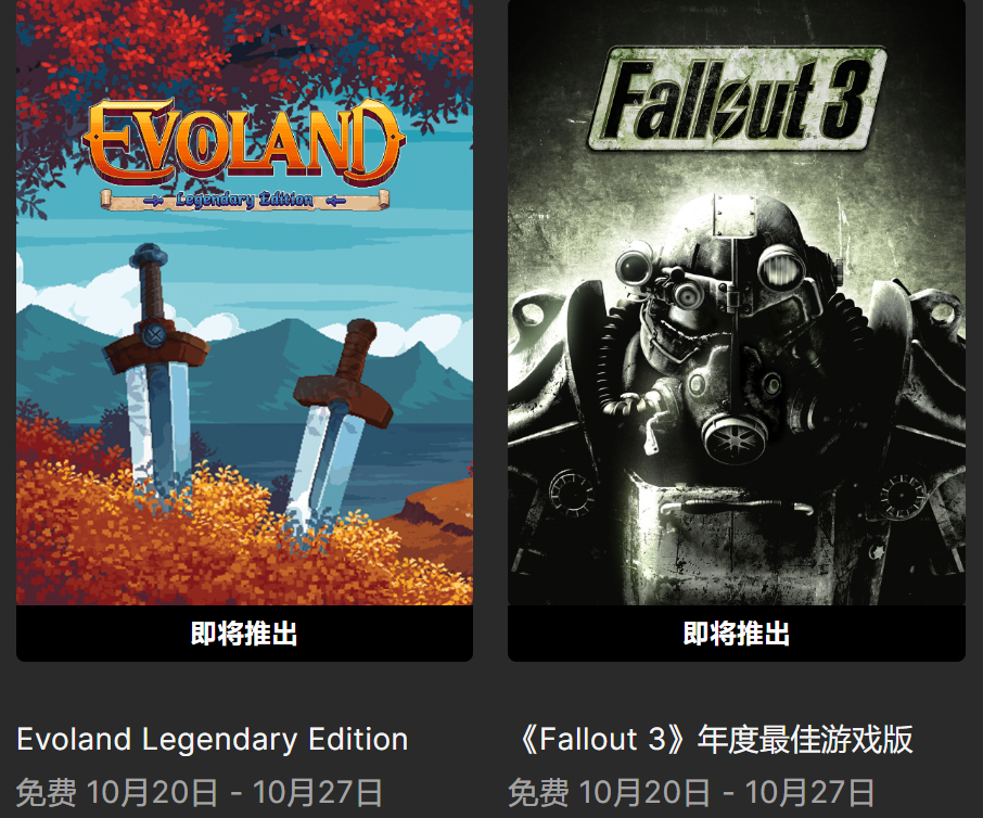 在以上兩款遊戲免費領取活動結束的同時,EPIC又將開啓《進化之地 傳奇版(Evoland Legendary Edition)》和《輻射3(Fallout 3)》年度版兩款遊戲的免費領取活動。