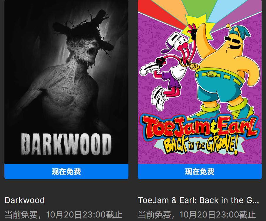 EPIC平臺《陰暗森林(Darkwood)》和《外星雙傻(ToeJam & Earl: Back in the Groove!)》兩款遊戲的免費領取活動將於今晚(10.20)截止,大家還沒有將其入庫的不要忘記!