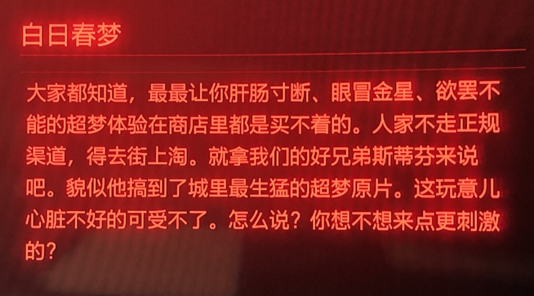 ⑨:《白日春梦任务》在进入超梦前提前把衣服武器脱下或者最好存入汽车储备箱,不然醒来去拿装备会发现辛苦弄来的插槽降级了(BUG未修复)(另外请放心,腰子没被噶)