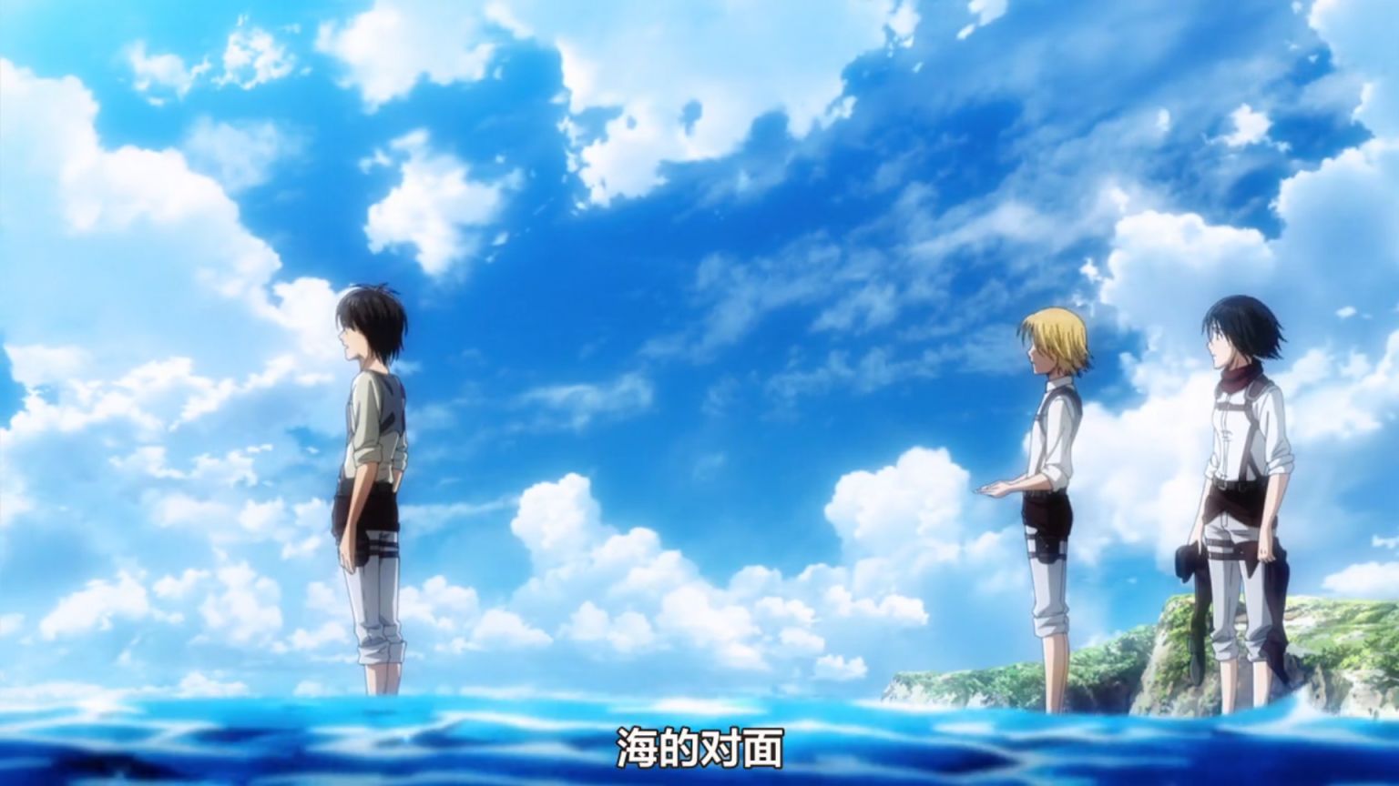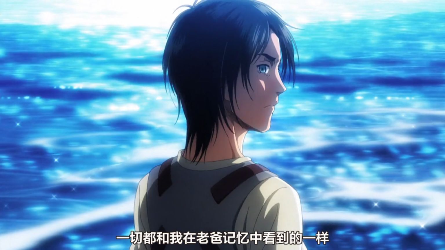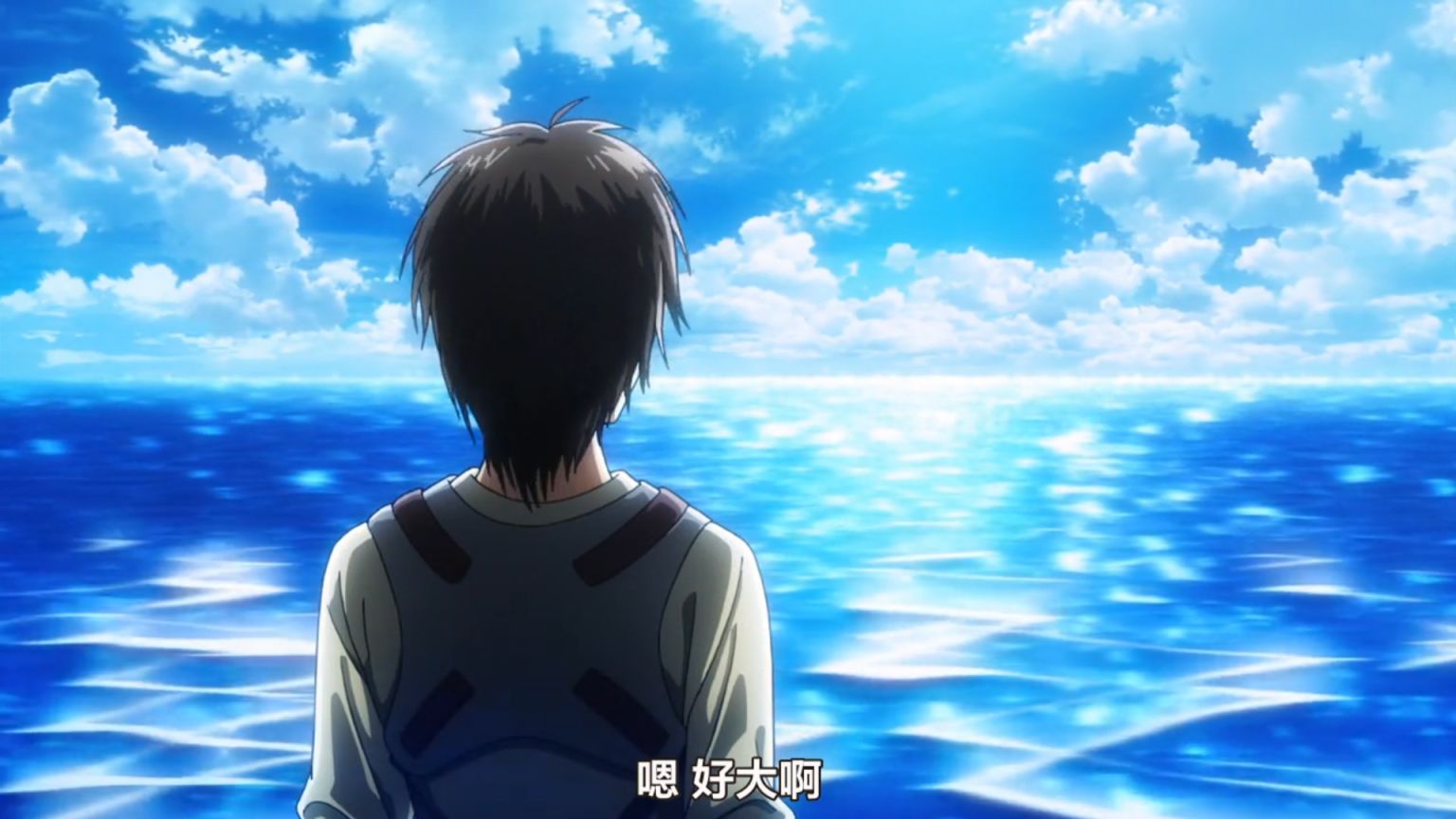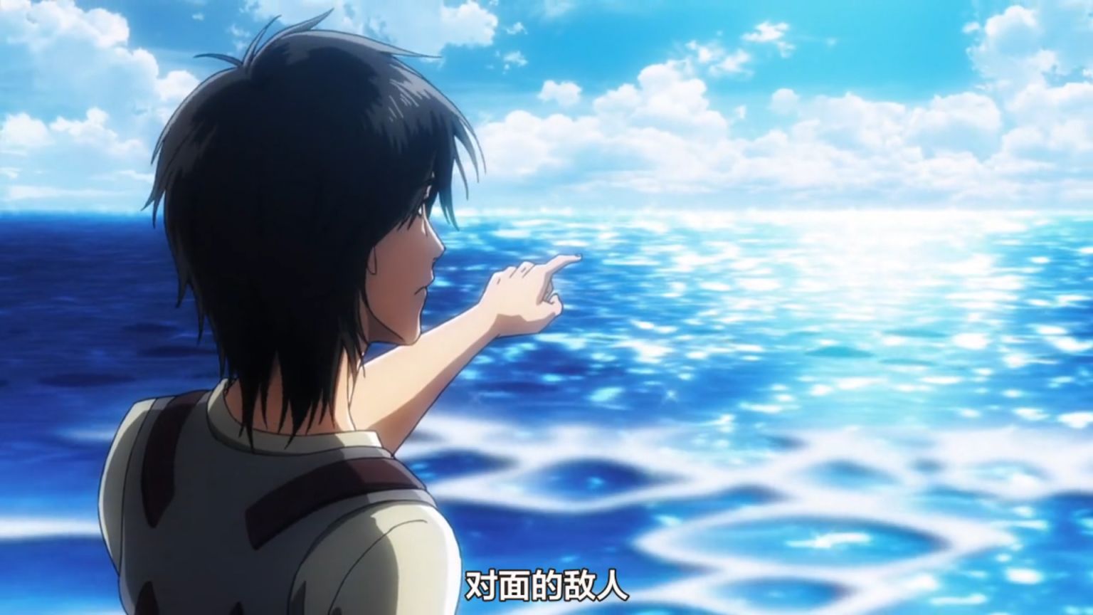第三季的最后,艾伦他们终于到达了海边,这里和其父亲的日记与书上所记载的一样,可是艾伦却一点也没有了初见海的那种惊奇感,取而代之的则是对于未来强烈的迷茫。此刻海的那边再也没有什么所谓的自由,而是充满了无穷无尽的对于艾尔迪亚人的仇恨。