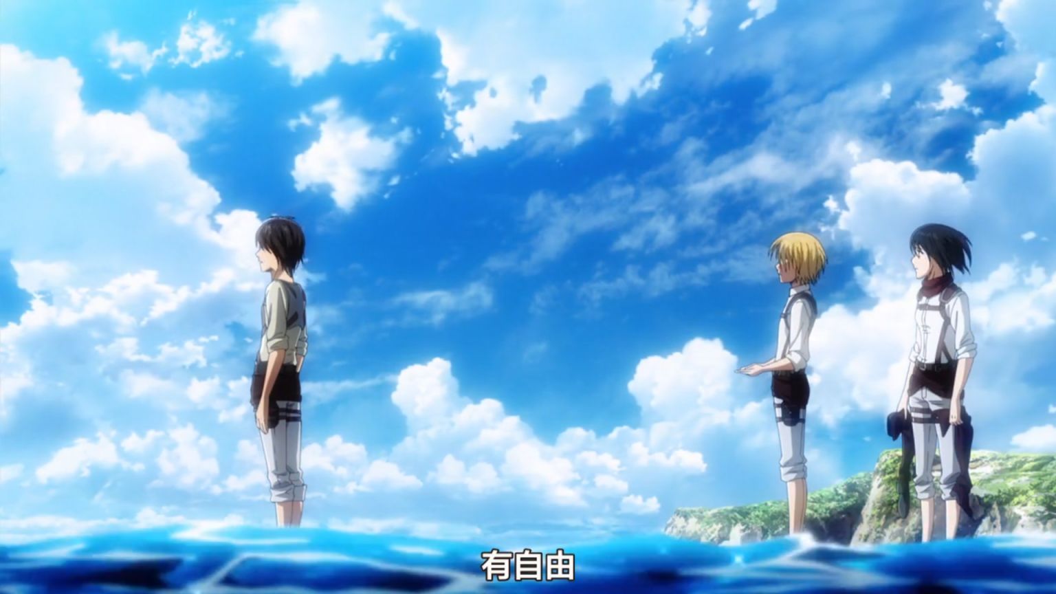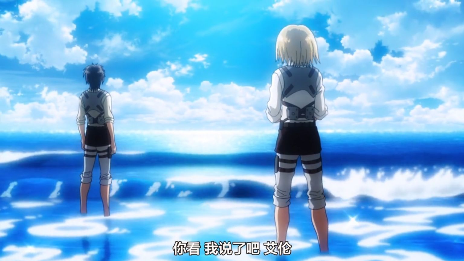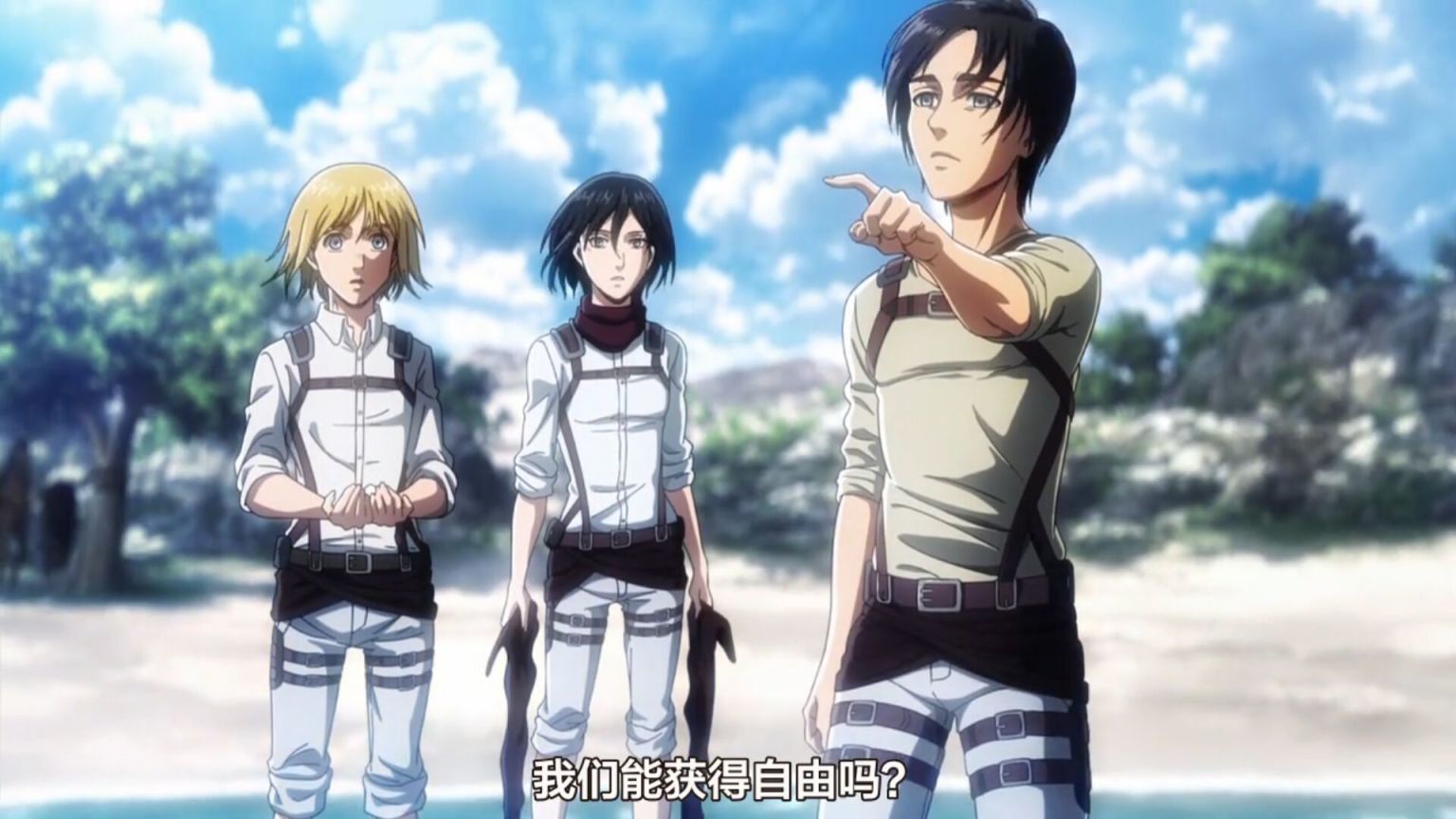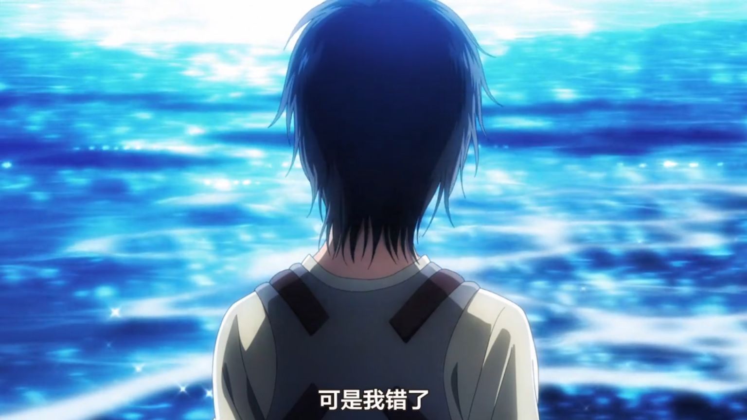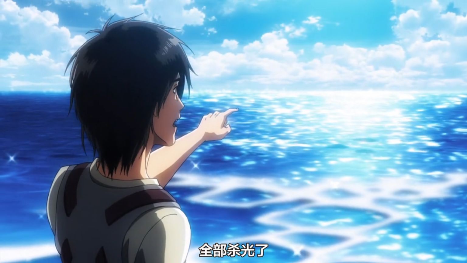 第三季的最后,艾伦他们终于到达了海边,这里和其父亲的日记与书上所记载的一样,可是艾伦却一点也没有了初见海的那种惊奇感,取而代之的则是对于未来强烈的迷茫。此刻海的那边再也没有什么所谓的自由,而是充满了无穷无尽的对于艾尔迪亚人的仇恨。
