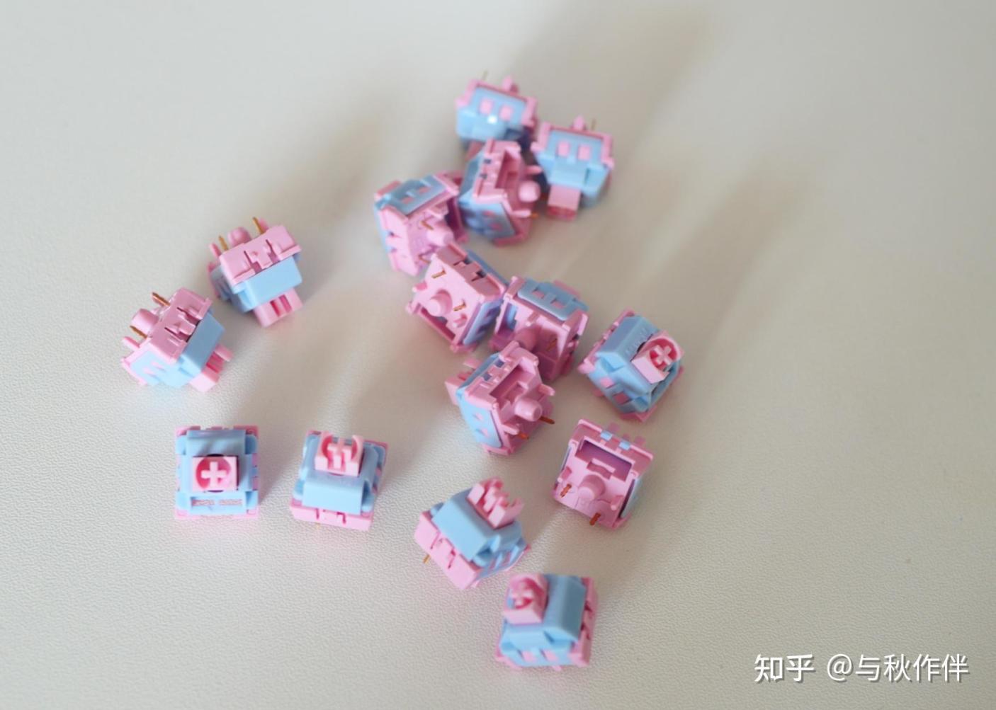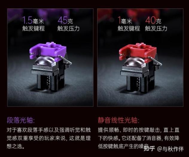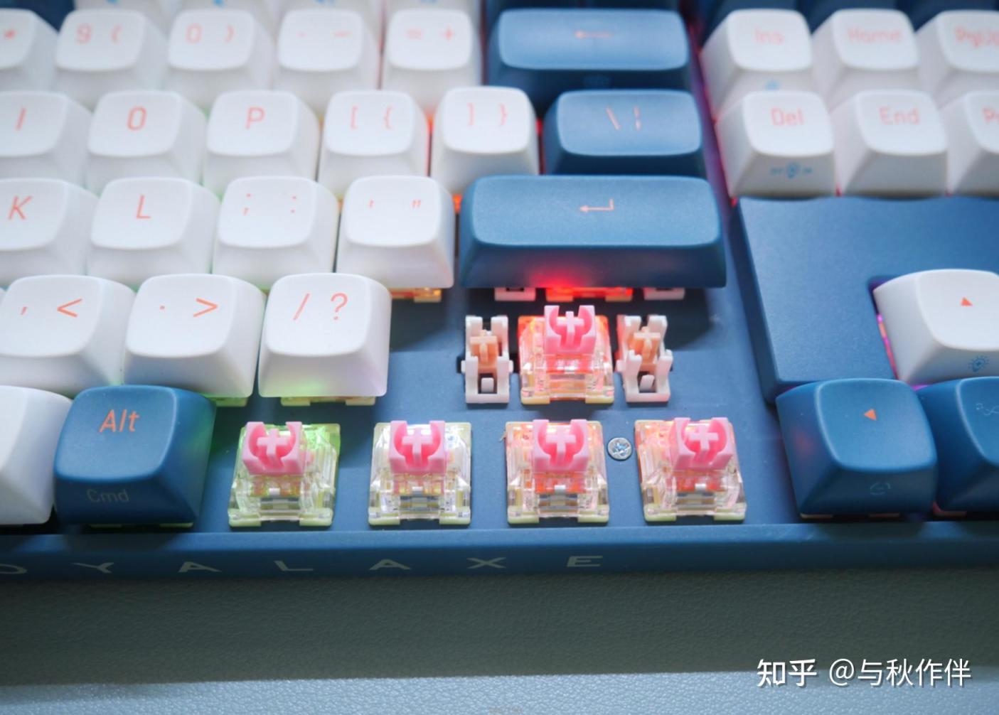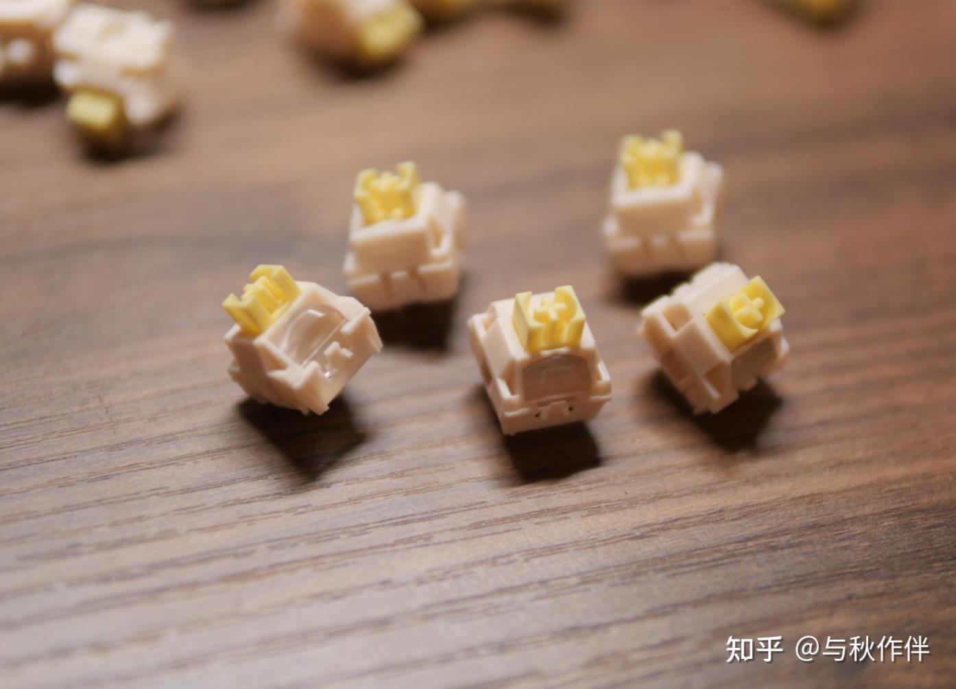 有声大段落轴也就是类青轴,现在主要被凯华的扭簧发声段落轴统治,它和传统有声段落轴结构上有点小小的区别,声音更像按动圆珠笔的声音,段落感更明显,按起来更解压。主流的记住凯华的知夏轴和极地狐轴就可以了,量产键盘里,选这两款轴足够让你完整体验段落轴的神韵和快感。