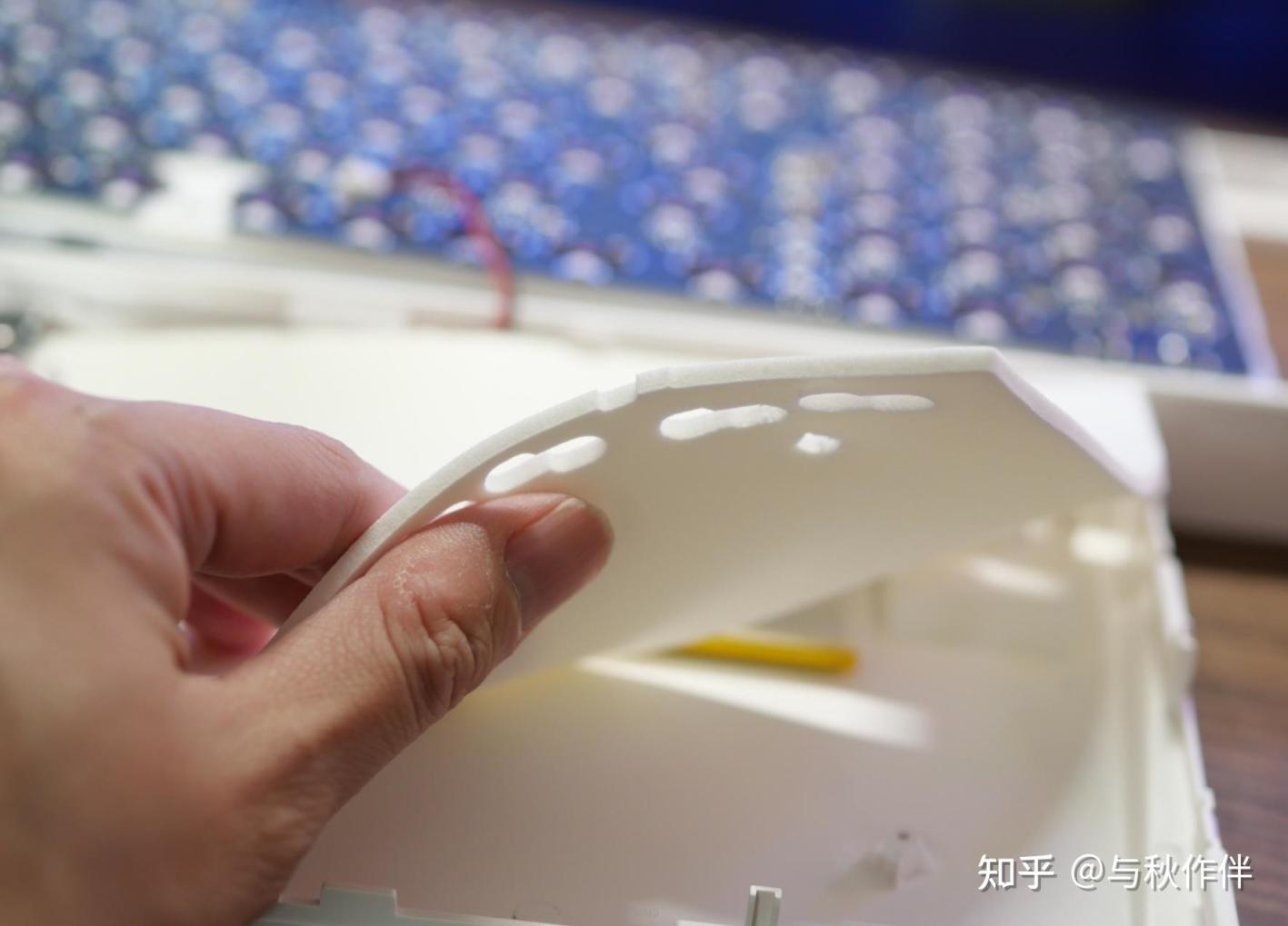 填充物是前面提过了,内部空间够大除了给整体结构提供下陷空间之外,也是给声音提供一个腔体,相当于音箱吧。HIFI轴体不用说,前面也提到过。减少共振的方式除了铝坨坨外壳之外,再就是尽量少的把按压的振动传导出去,方式无非就是使用板簧Gasket和单键开槽。