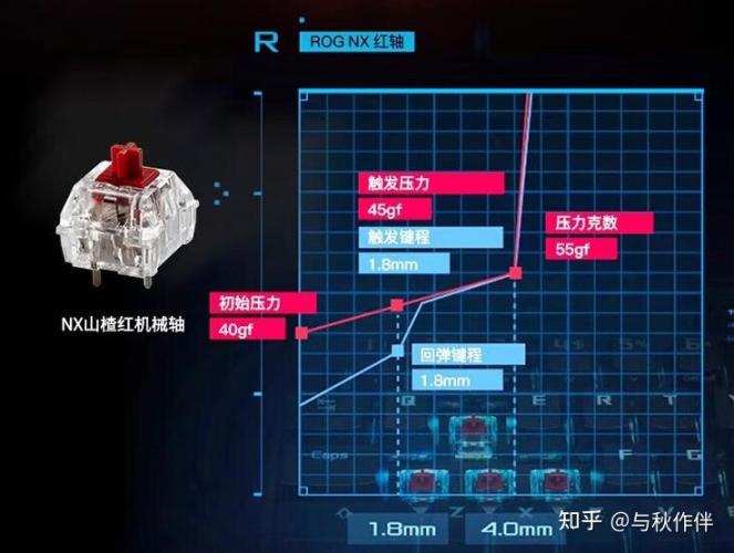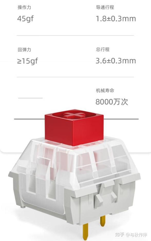 这个问题,上一部分已经提到了,但是这里细说。首先大多数轴以cherry红轴作为标杆,红轴的触发压力45g,总行程4mm,导通行程4mm,弹簧长度15mm。