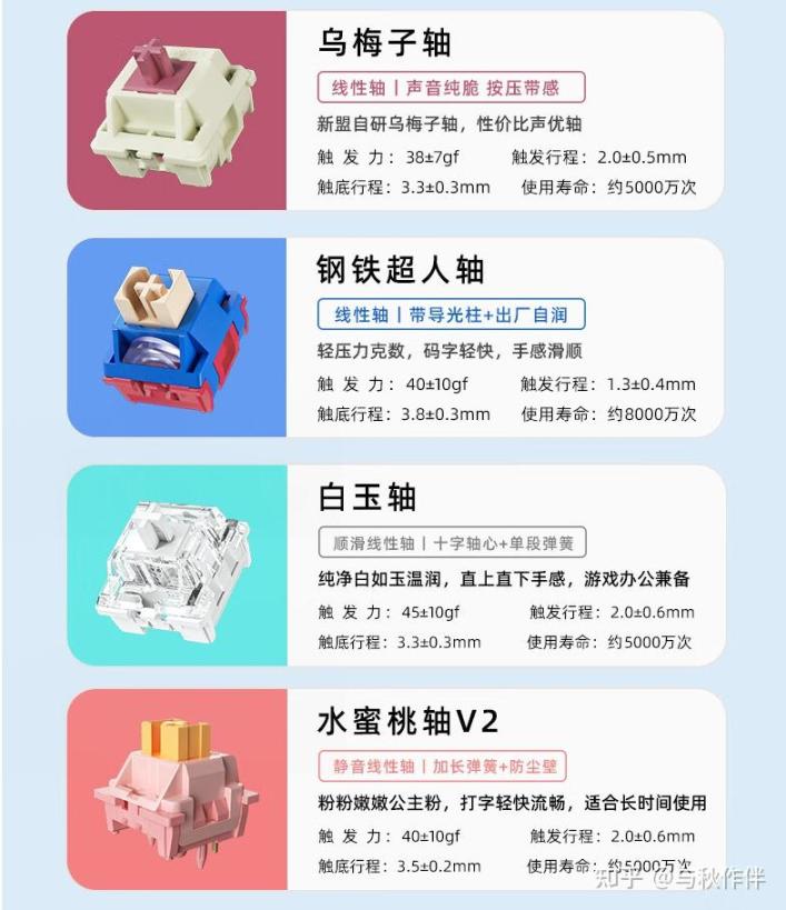 基本上各种轴体的商品页或者键盘商品页上关于轴体的介绍里会有这些信息,有的还会有相应的描述,我们的重点,就是来解读他们。