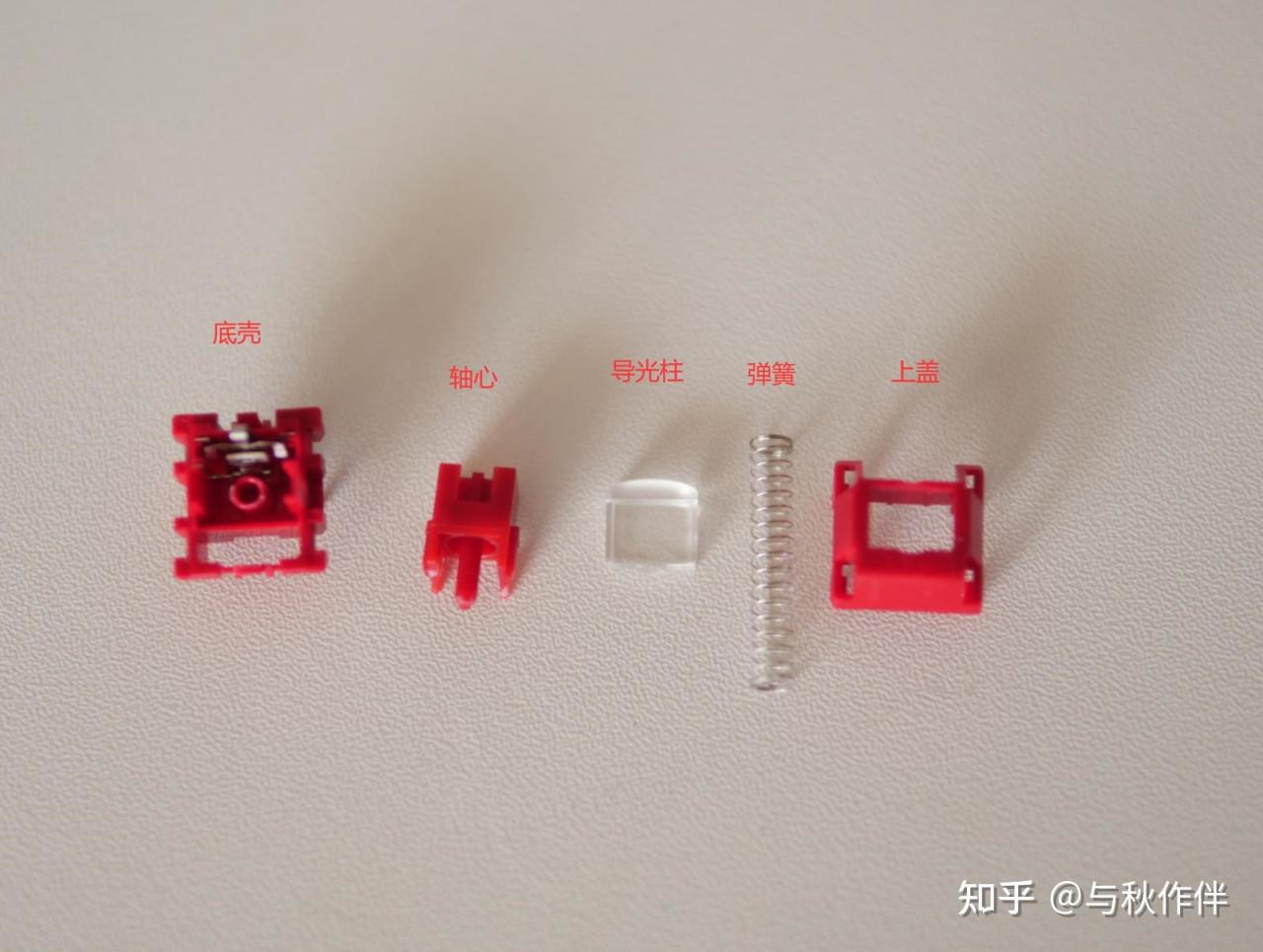 常规轴体就是普通的机械轴,也是市场上最常见的轴体,所有的什么热插拔、润轴这些操作都是针对这一类轴体(我还没听过有润光轴的)。它的结构基本上脱胎于cherry的MX轴体。主要由轴心、上盖、下盖、弹簧、弹片、针脚组成。其中三脚轴就只有中间一个固定柱和两个针脚,五脚轴则还有两个额外的固定柱。