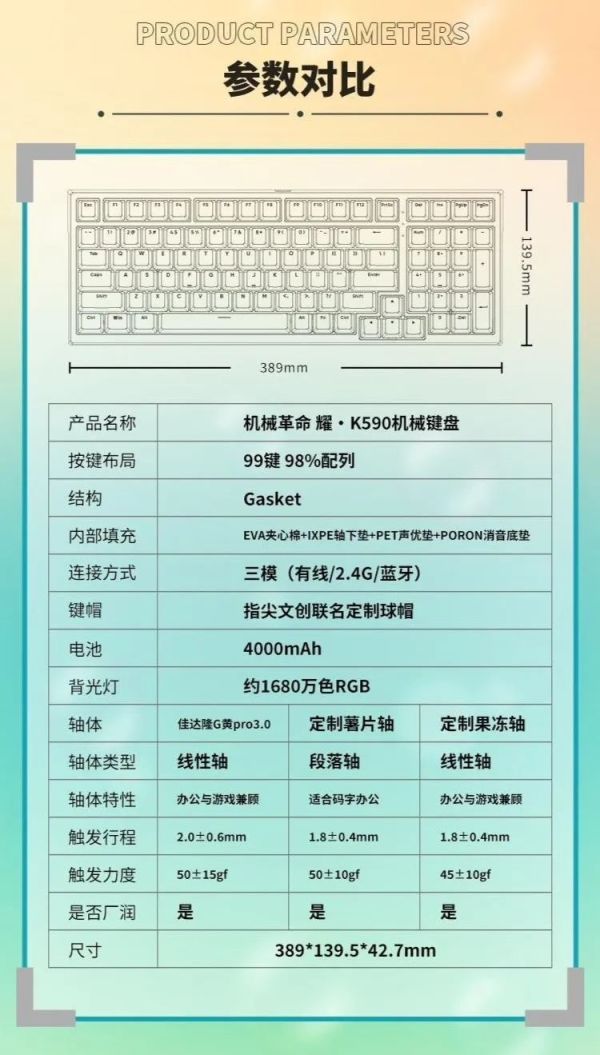 机械革命K590三模客制化机械键盘采用99键、Gasket结构、指尖文创联名定制球帽(双色注塑成型,内部四层填充)。