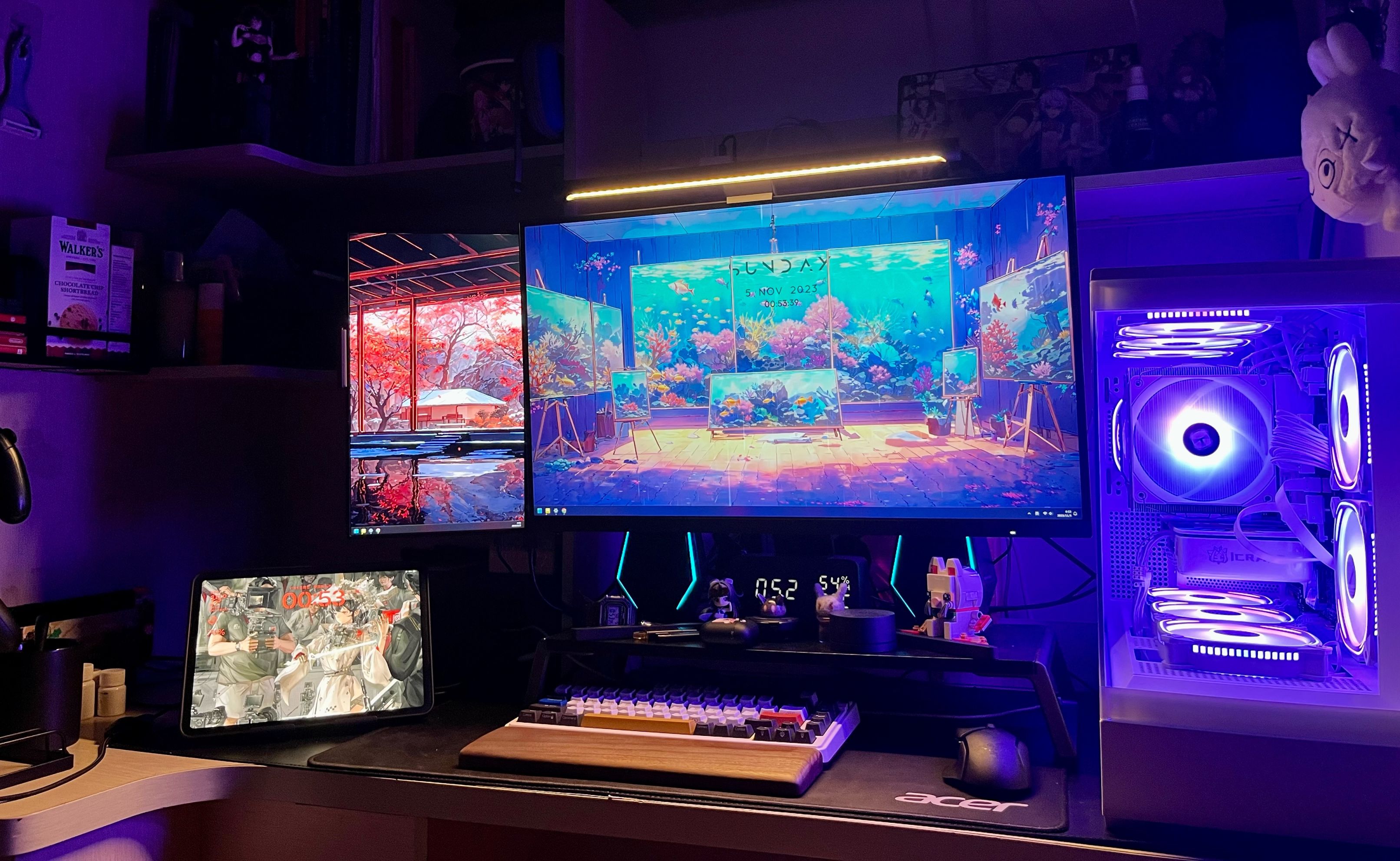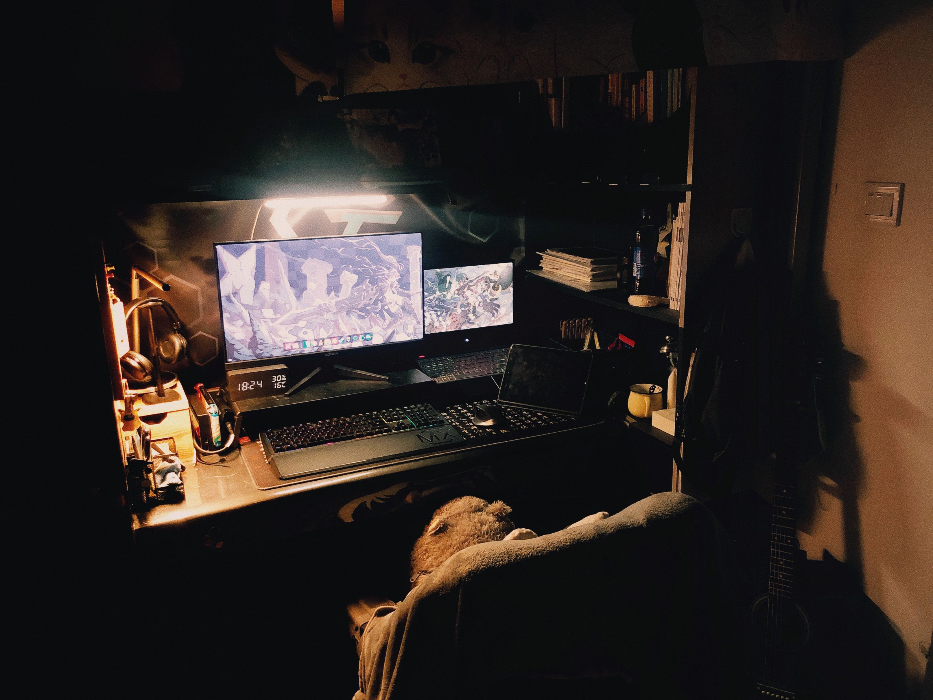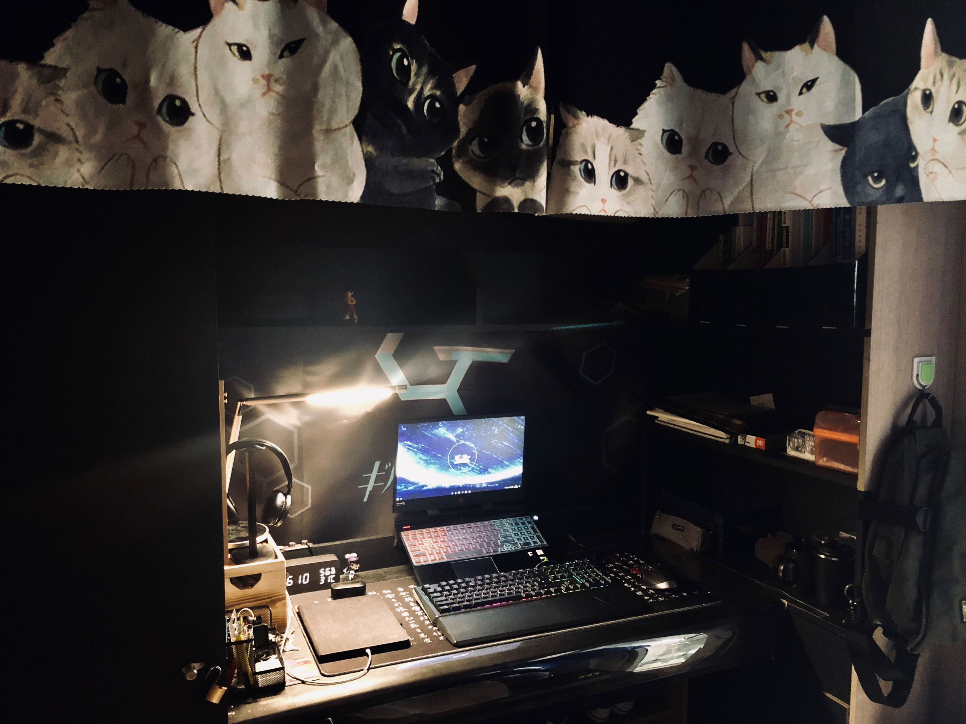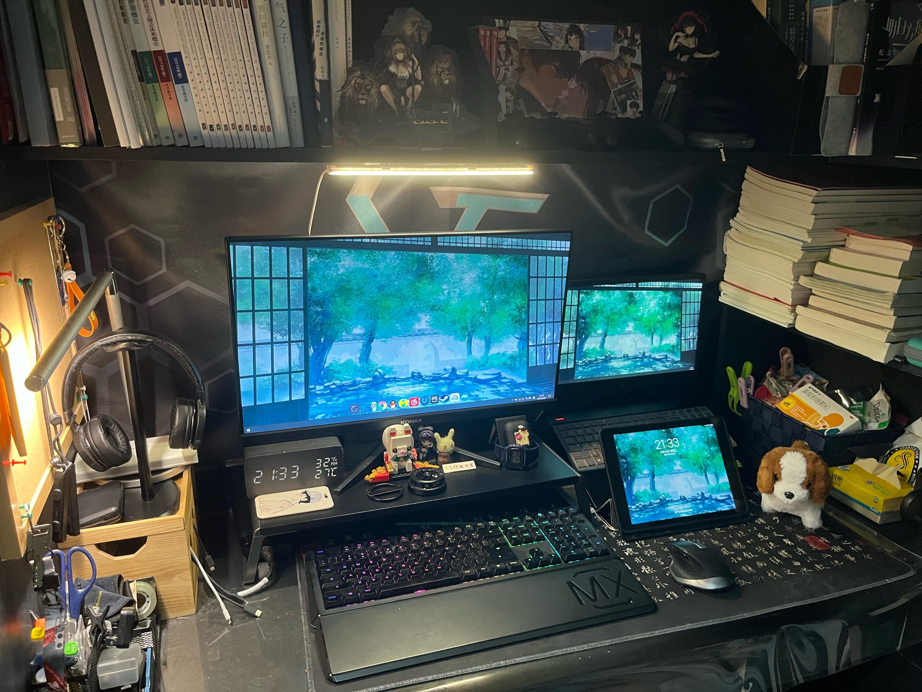 新电脑本来也未曾打算选择白色海景房的,但看过一次就难以忘怀,最终促成了我的刀把配置,不过白色海景房在我黑色桌面上到也未显得格格不入。为了把主机放在桌上,我又重新规划了桌面空间以迎接新主机,照明也换成了广受好评的屏幕挂灯,iPad则是用支架放置,不过现状依然不够让我满意,屏幕显示的割裂和ipad操作的不方便(每次都要取下来)而支架本身的限制和桌柜设计的不合理导致我始终没有找到合适的角度安放显示器支架。