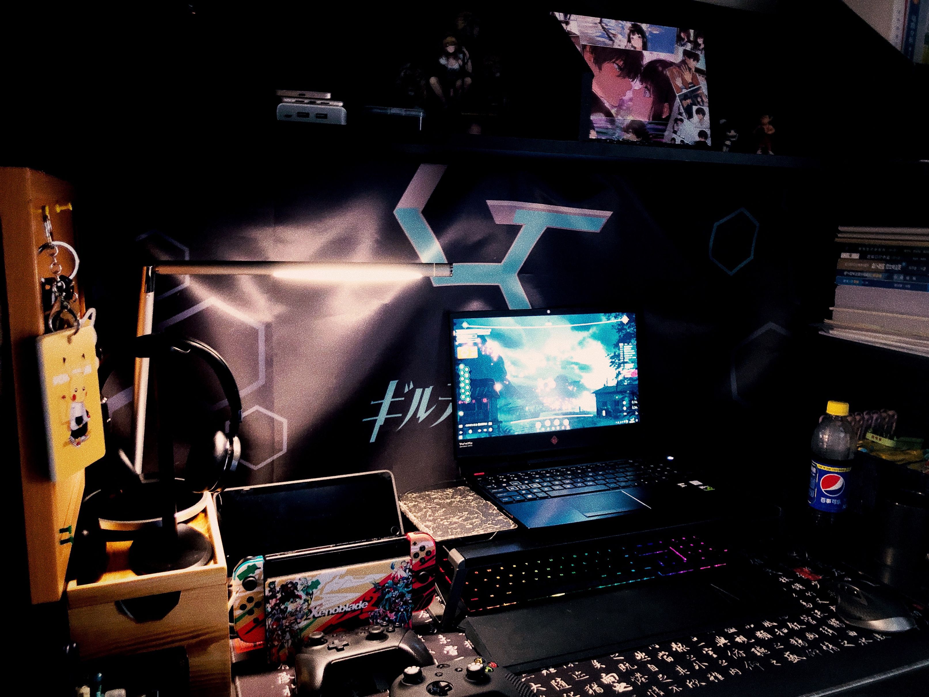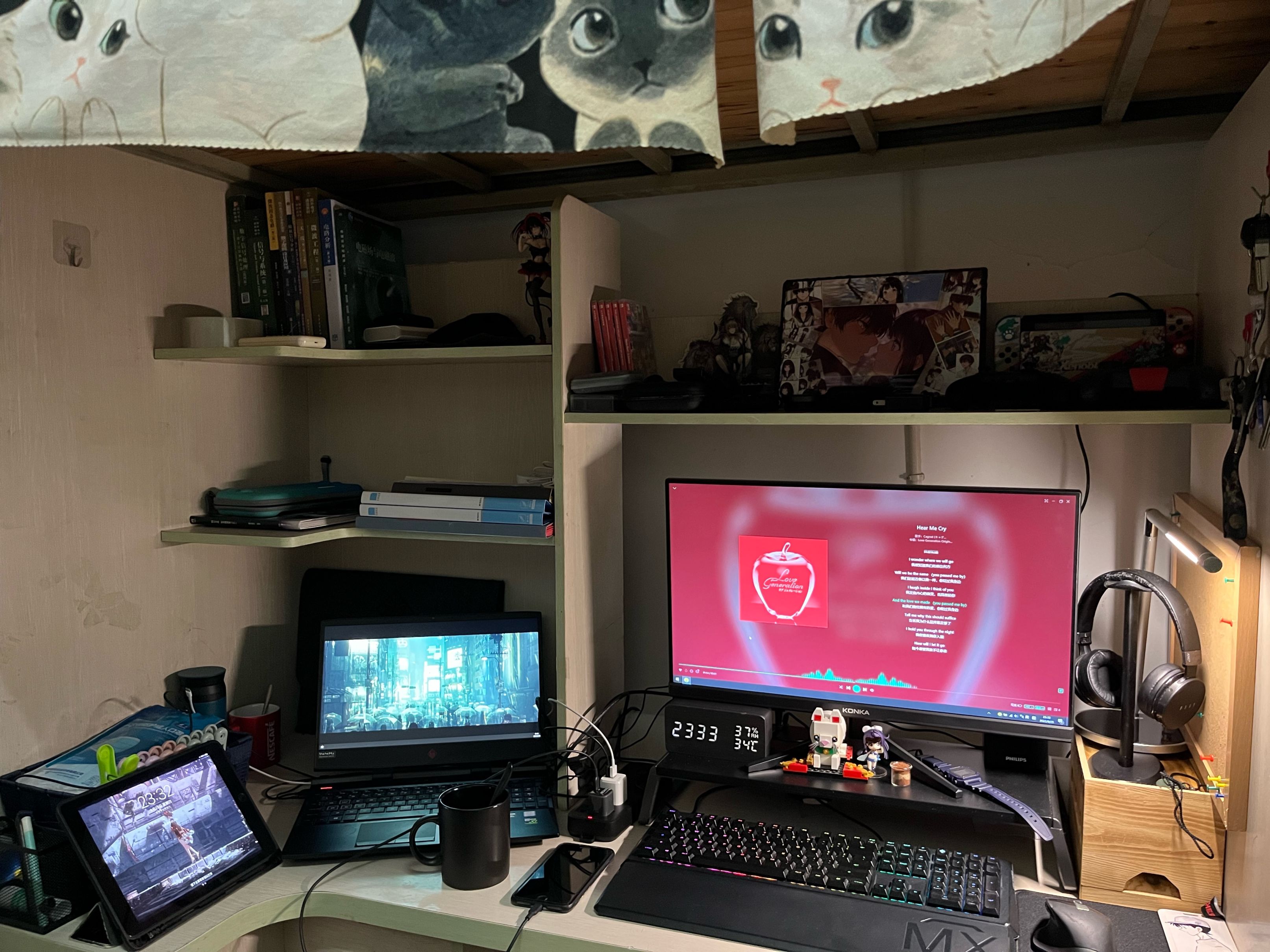 此时已是疫情返校后,在疫情期间还幸运的在德国亚马逊抢到了原价的欧版ns,贴纸选择了我最喜欢的异度之刃2。为了应对越来越拥挤的桌面空间,选择了黑色的增高架用来收纳键盘。另外要特别提一下一旁贴在柜子上的软木板,搭配大头钉倒是为我的钥匙找到了归处,同时也方便了我顺手把一些记录重要事情或是胡思乱想的小纸条钉在上面。