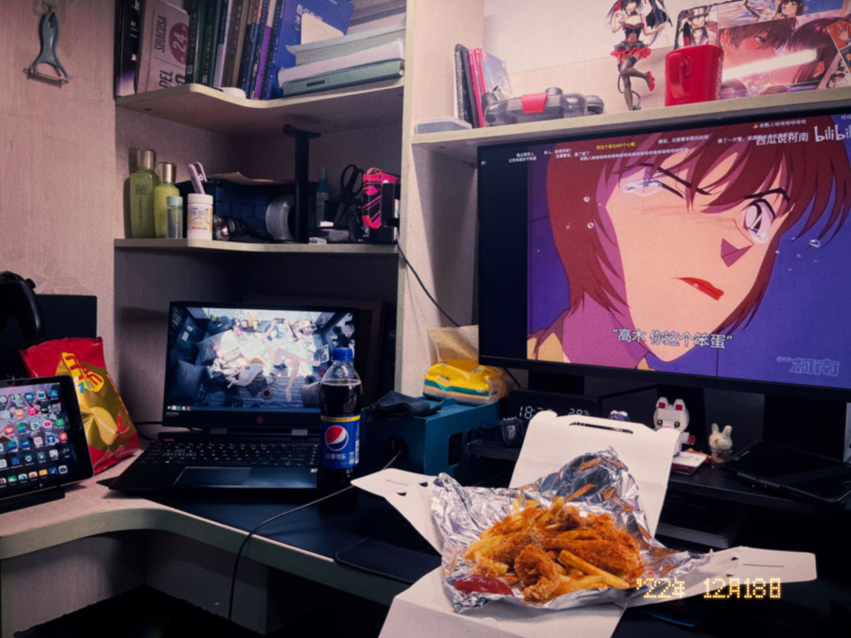 由于ns的投屏需要,在不久后便选择购入的24寸的显示器,加之本身主要是为了给ns使用,所以刷新率也选择了最便宜的60hz(主要还是没钱),平时搭配笔记本组成双屏,倒让我越发喜欢,以至于如今养成了一个屏幕游戏一个屏幕视频的习惯。一并购入的小音箱则是隐藏在了显示器后面。