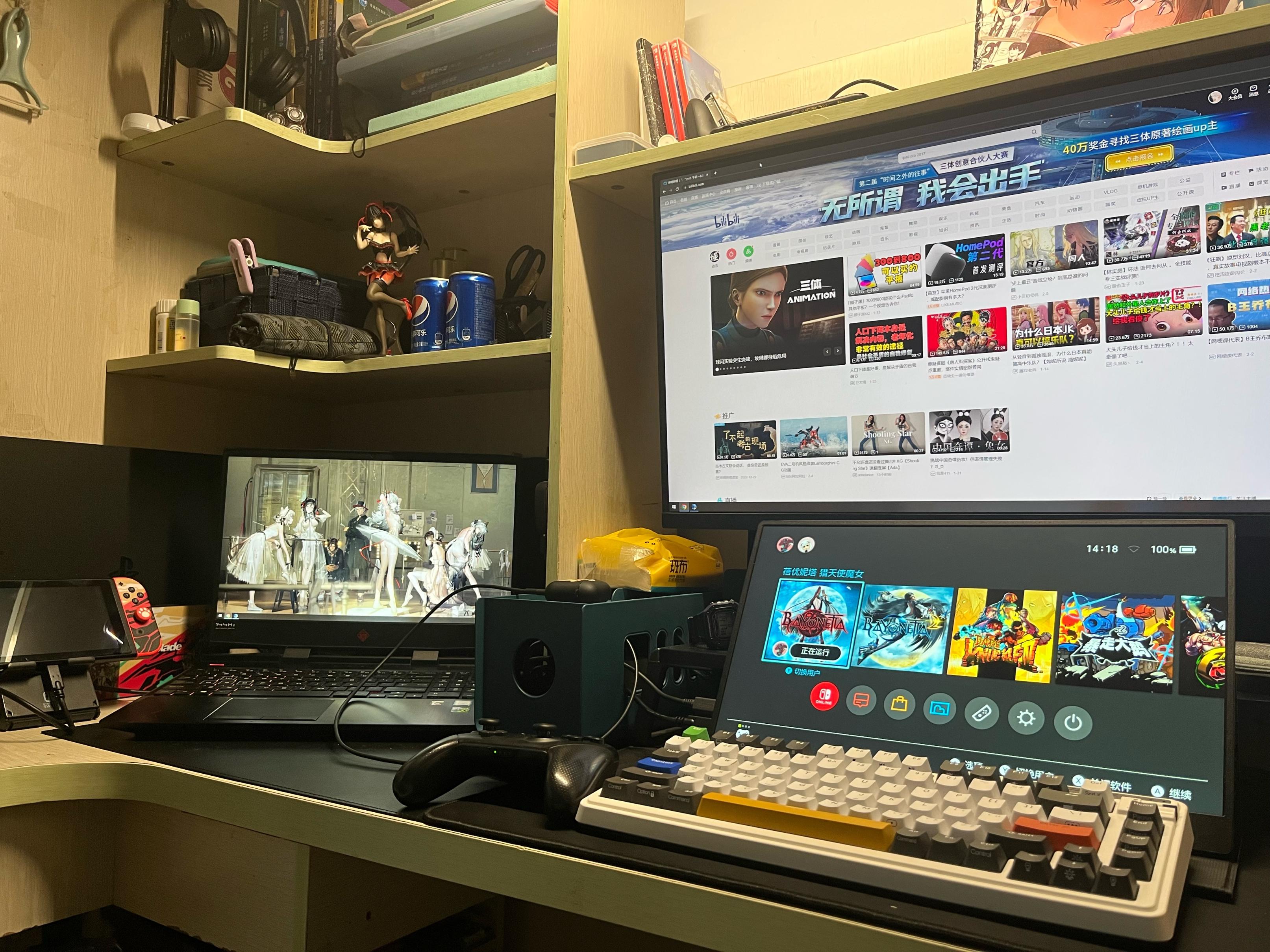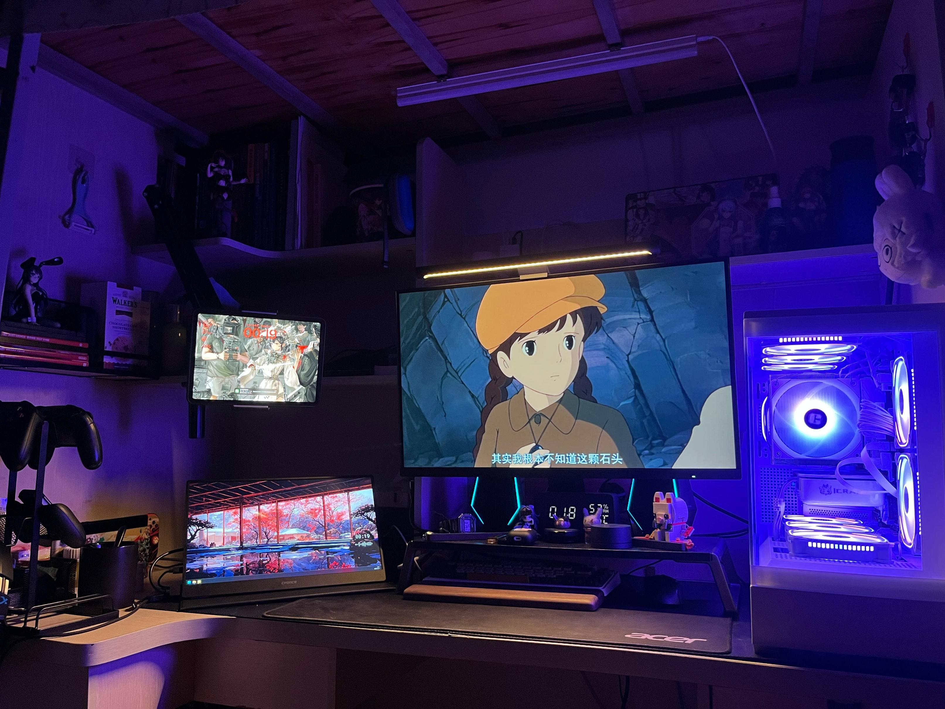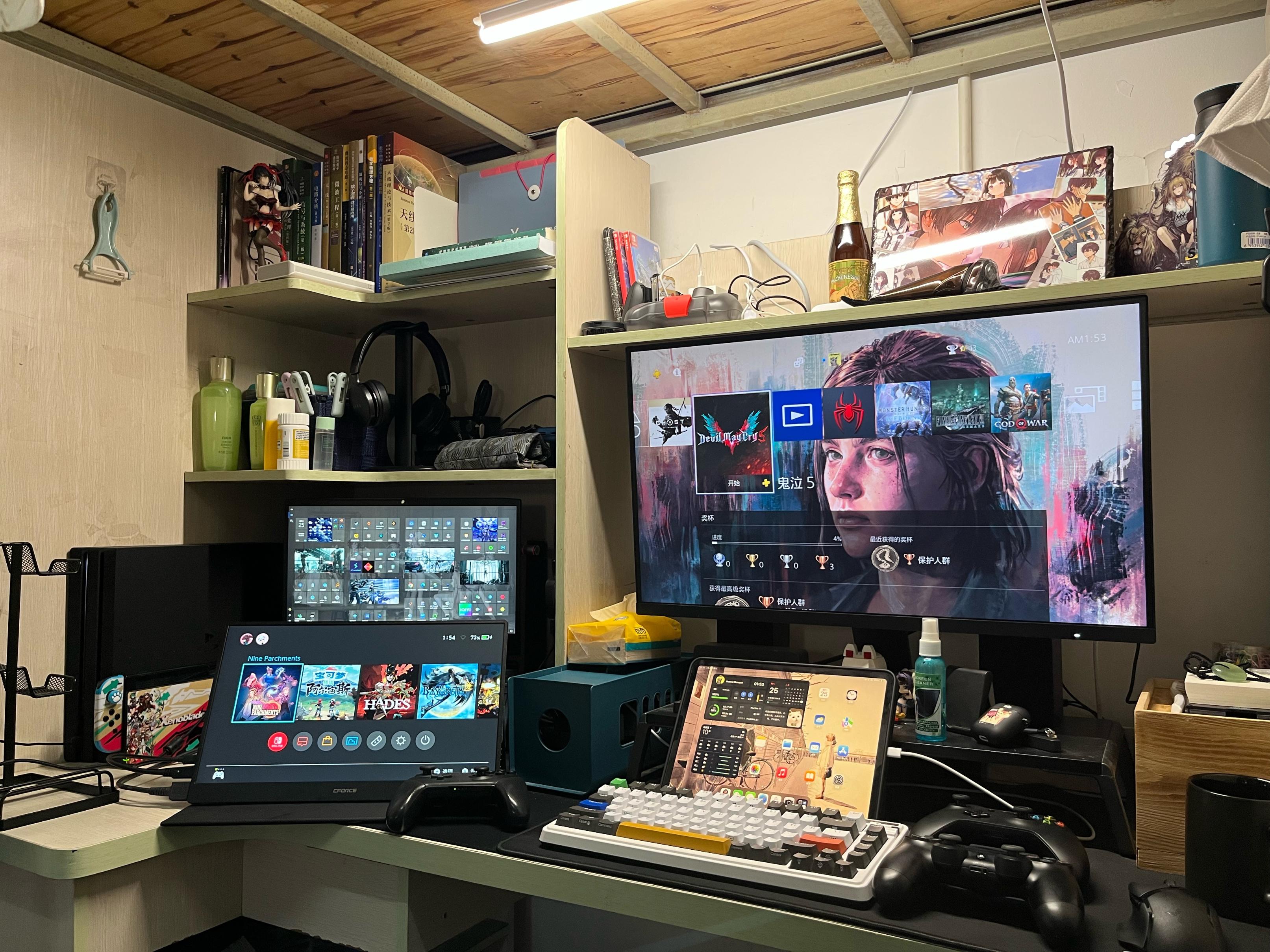 之后便是购入了朋友的ps4pro,又因为假期偶尔出门和朋友玩ns的需要,又添置了便携屏幕,平时正好组成了三屏,这也是我屏幕最多的时候。不过便携屏本身支持输入切换且自带音响,新显示器也能通过一分二接口在ps和pc间进行切换,倒也还算让我满意。黑色的手柄架倒也算出乎意料的满意,不仅放下了御三家的手柄,还多留出一个位置正好放下我的耳机。