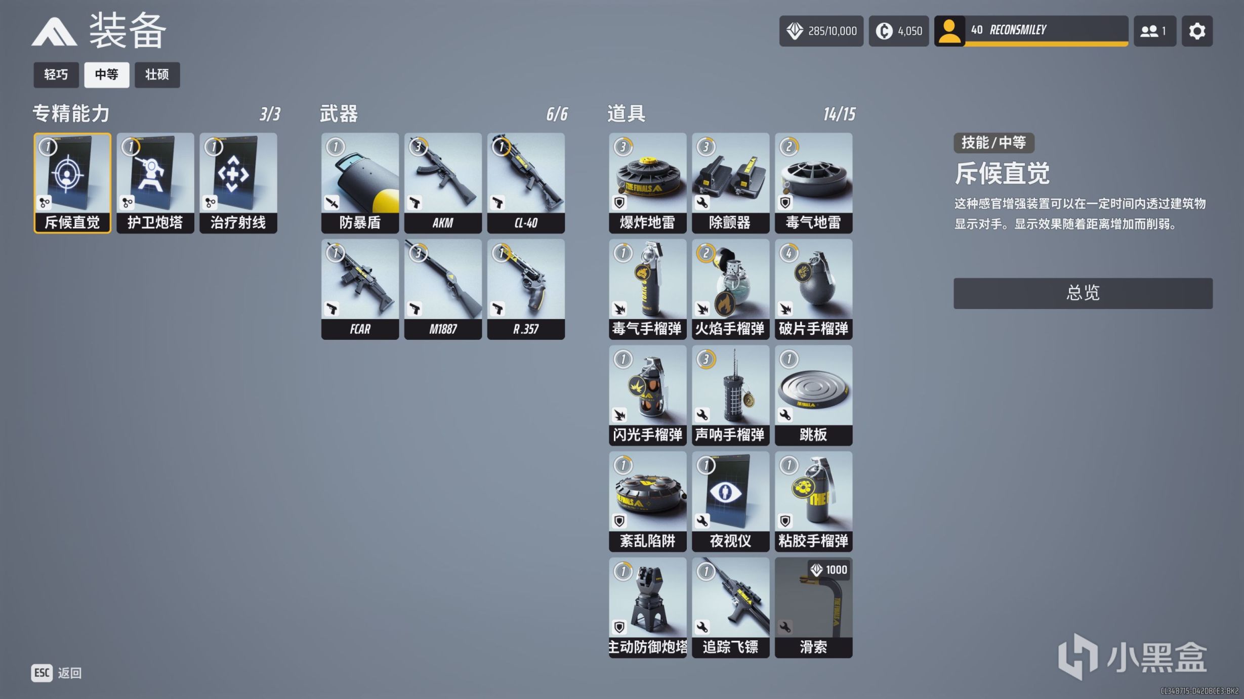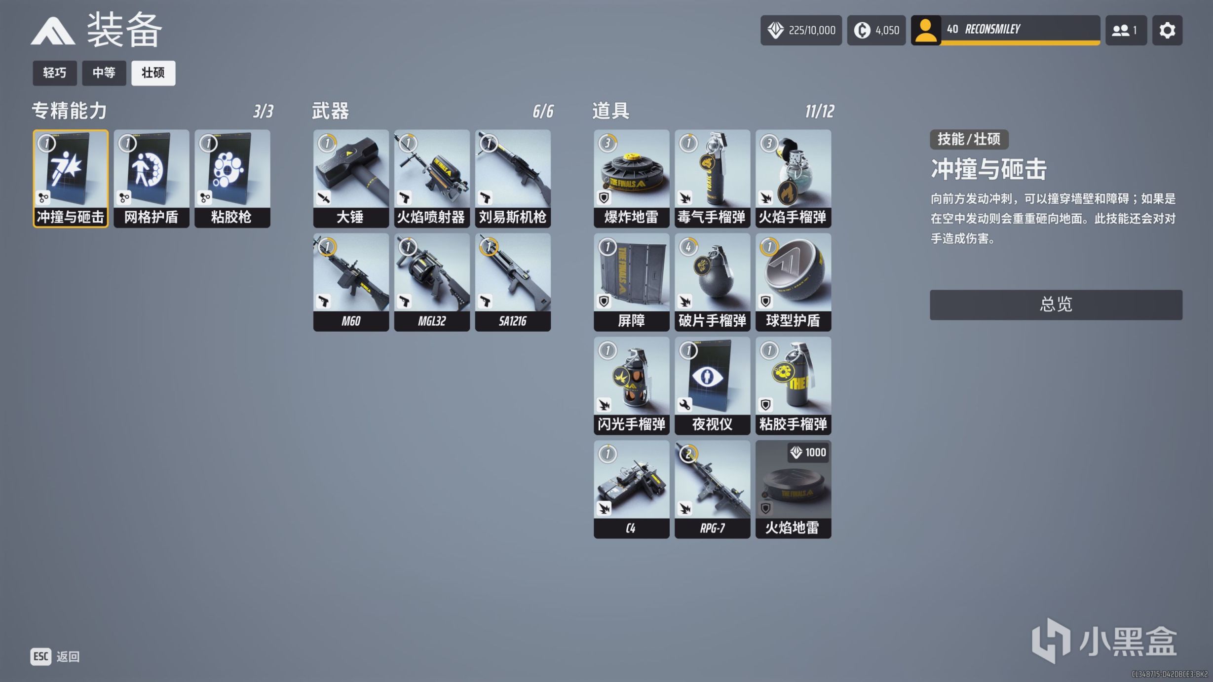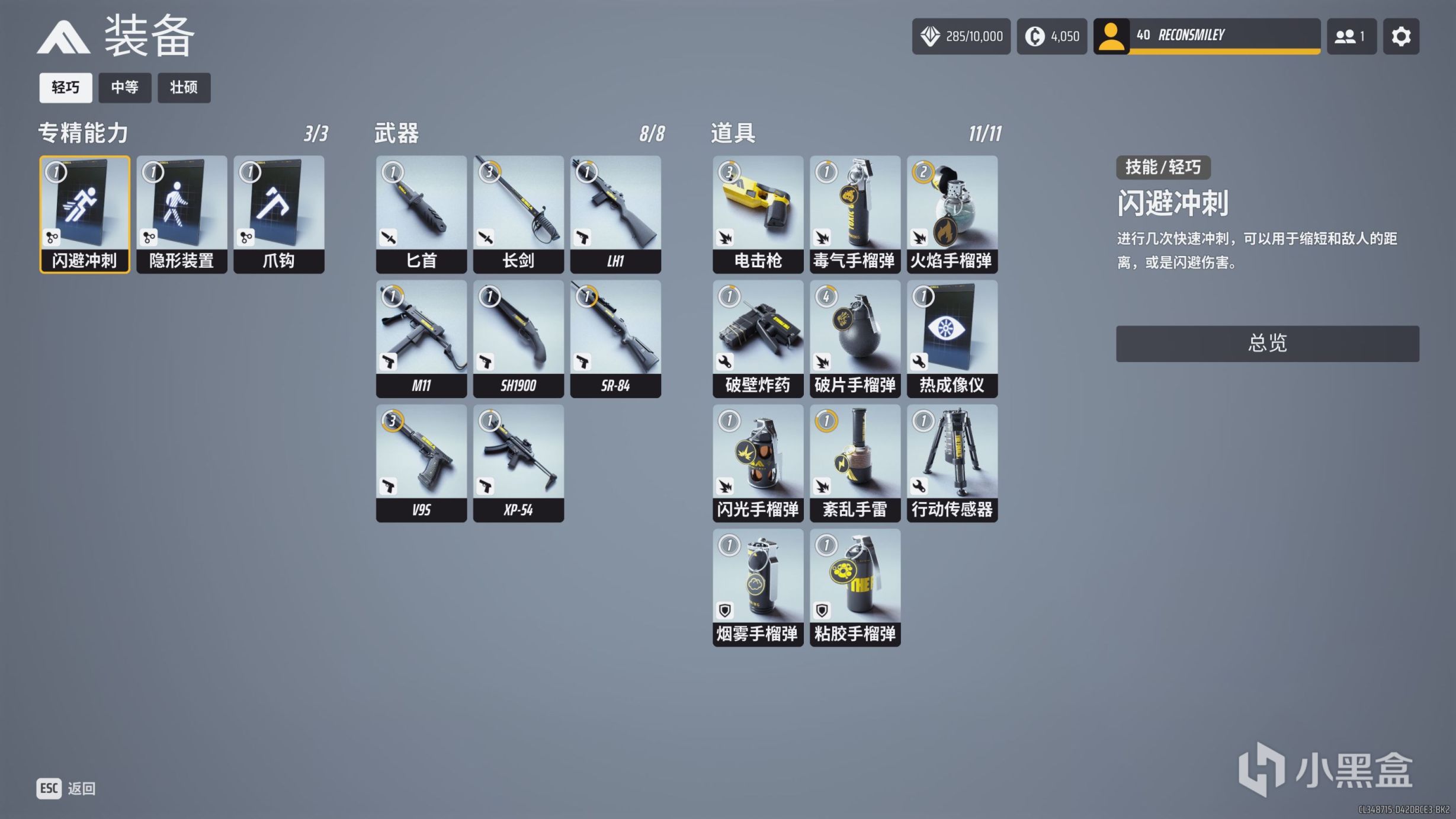 配装搭配:主配装1主动技能+1武器+3道具,以及一套同配置的预备配装