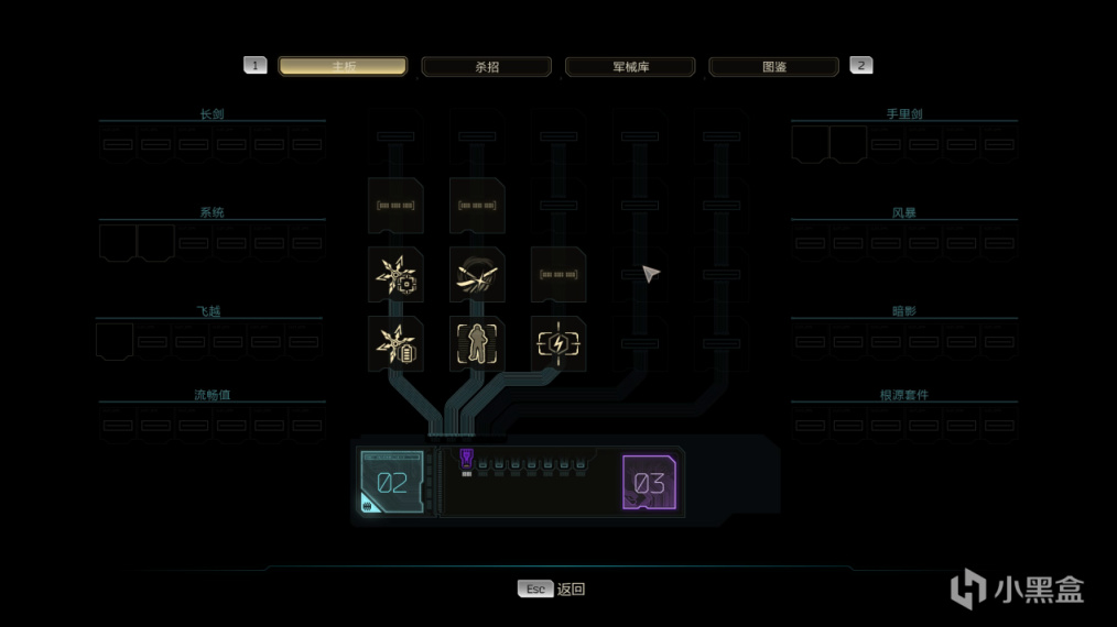 本作的技能分为长剑、系统、飞跃、流畅值、手里剑、风暴、暗影、根源套件共8类,数量多达40种以上,这些技能需要安装到5条主板槽上,同一条槽上只能装备相同类别的技能,要到后期才能解除这个限制,所以也比较考验技能的搭配,适当的组合还能组出一些强力的build,降低一些游戏难度。