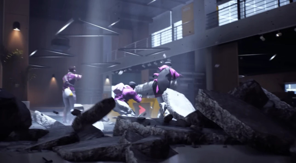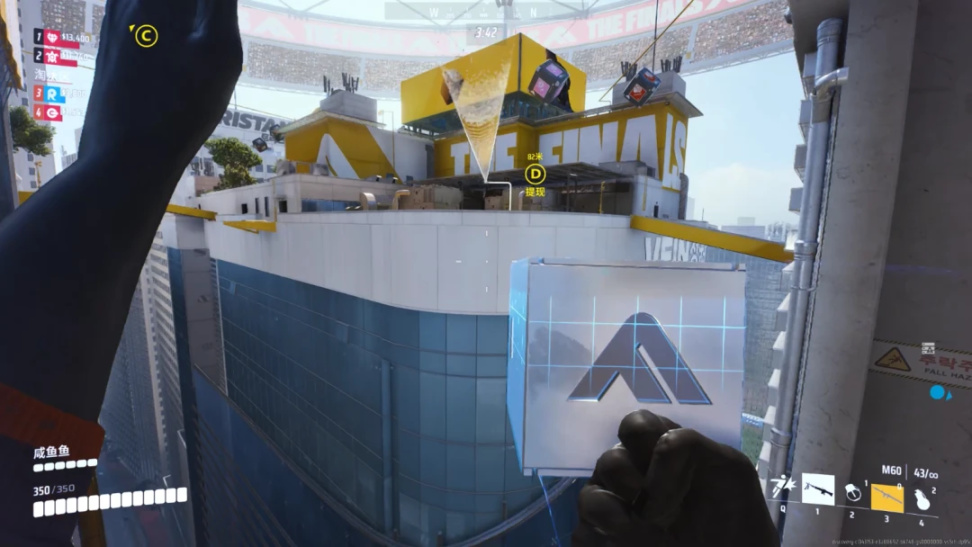 《The Finals》地圖並不大,建築也十分立體,樓層、牆板的高度可破壞性讓小空間的戰鬥體驗非常爽快。地圖中四處可見跳板、鉤鎖等高速移動設施,讓未攜帶位移技能的角色同樣能實現高速移動。