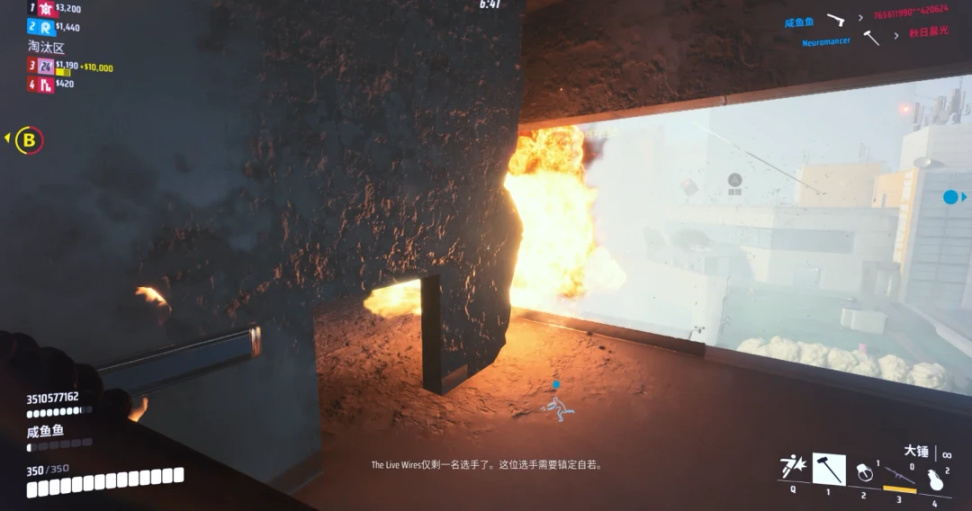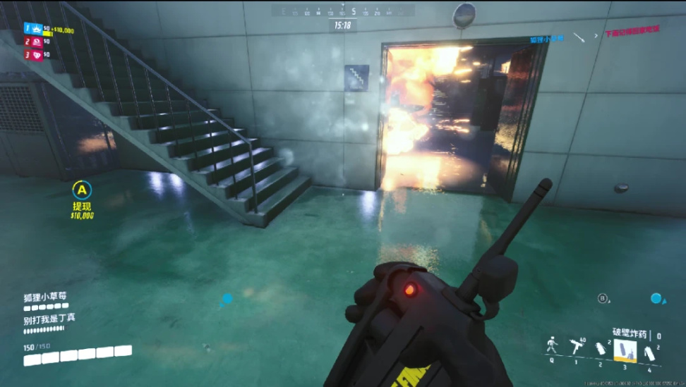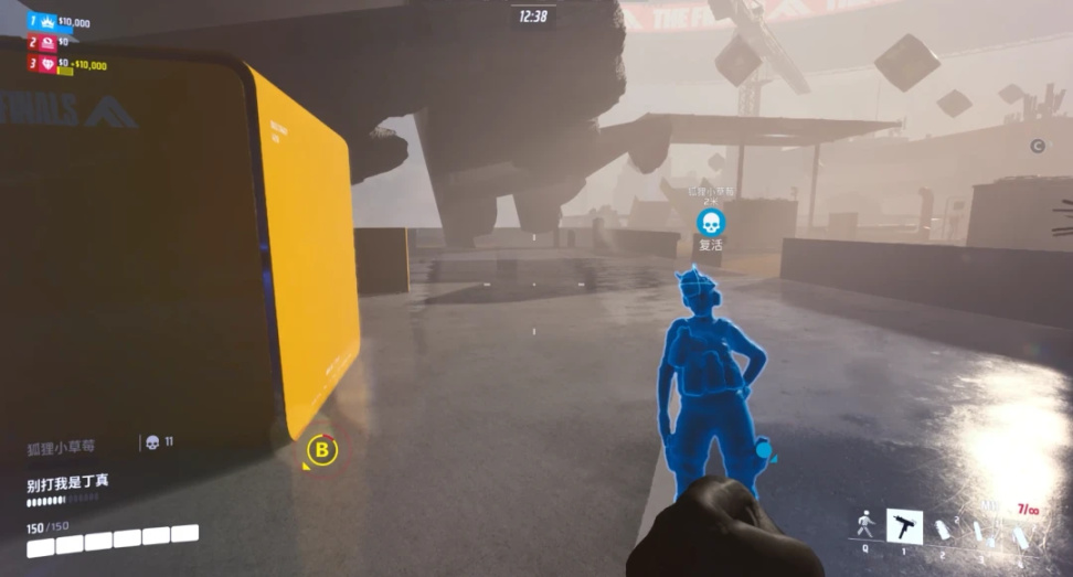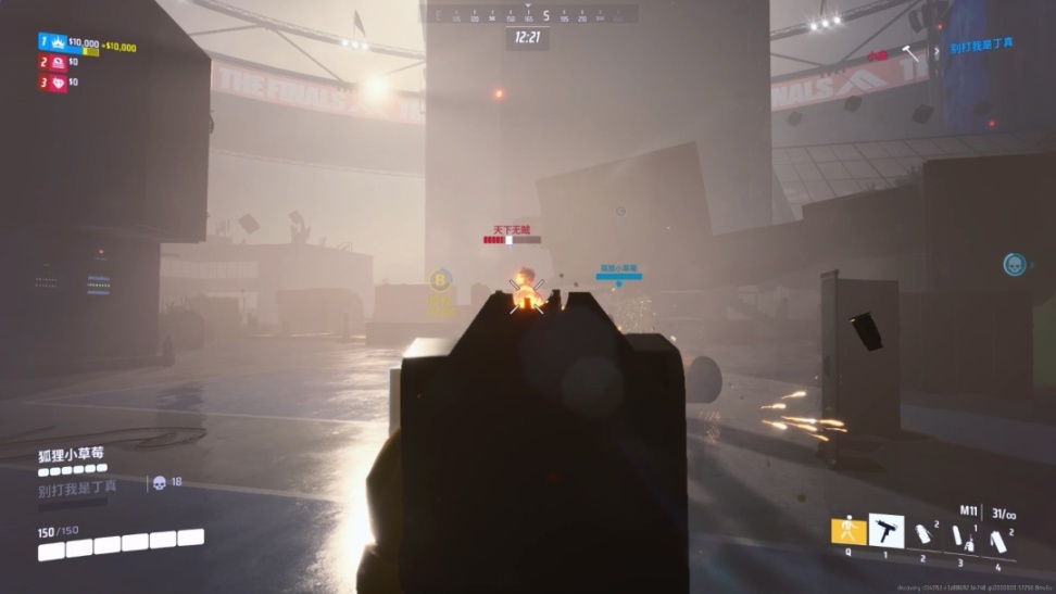 不同於縮圈帶來的緊迫感,《The Finals》中玩家出於對“金幣”的追逐,從開始的獲取金幣階段,到需要讀條時間的儲蓄階段。目標從始至終都非常明確,身價最高的人或者隊伍會成爲其他人的狩獵目標。爲了加快遊戲的節奏,在畫外音的提示之外,移動中的保險箱UI和存錢的進度都會實時顯示在屏幕上。能夠中途搶佔歸屬權的設計,也確保了戰鬥前中後期的收益,不至於讓趕來的玩家白折騰。