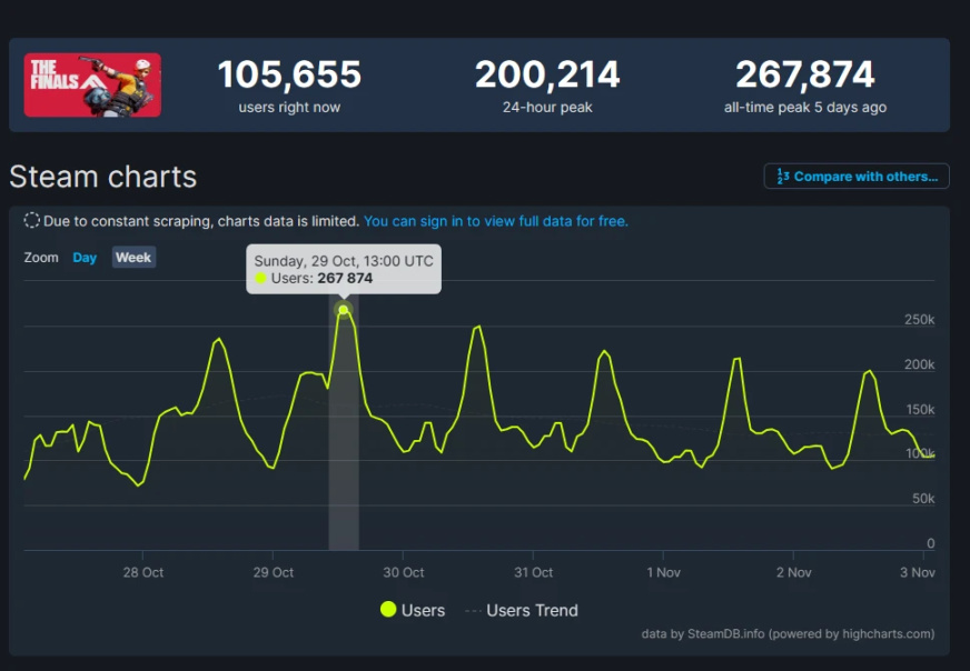 最近一款名爲《The Finals》的FPS團隊競技遊戲在玩家羣體中流行起來。許多著名FPS職業選手都體驗了這款遊戲。憑藉爽快的射擊手感與建築可破壞的特色,迅速佔領各大視頻網站的頭條,測試上線以來在Steam上,最高同時在線人數超過26萬!