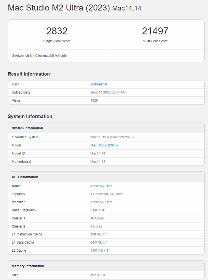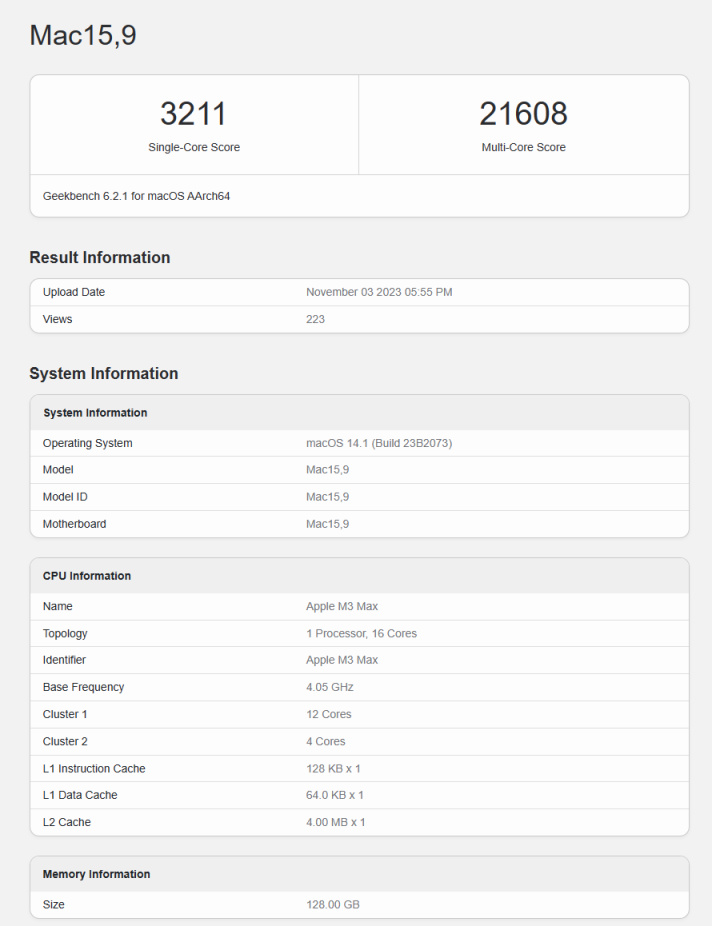 从 Geekbench 列出的“Mac15,6”标识符来看,该跑分来自于 14 英寸的 MacBook Pro 机型。该机运行 macOS 14.1 系统,配备 36.00 GB 内存。