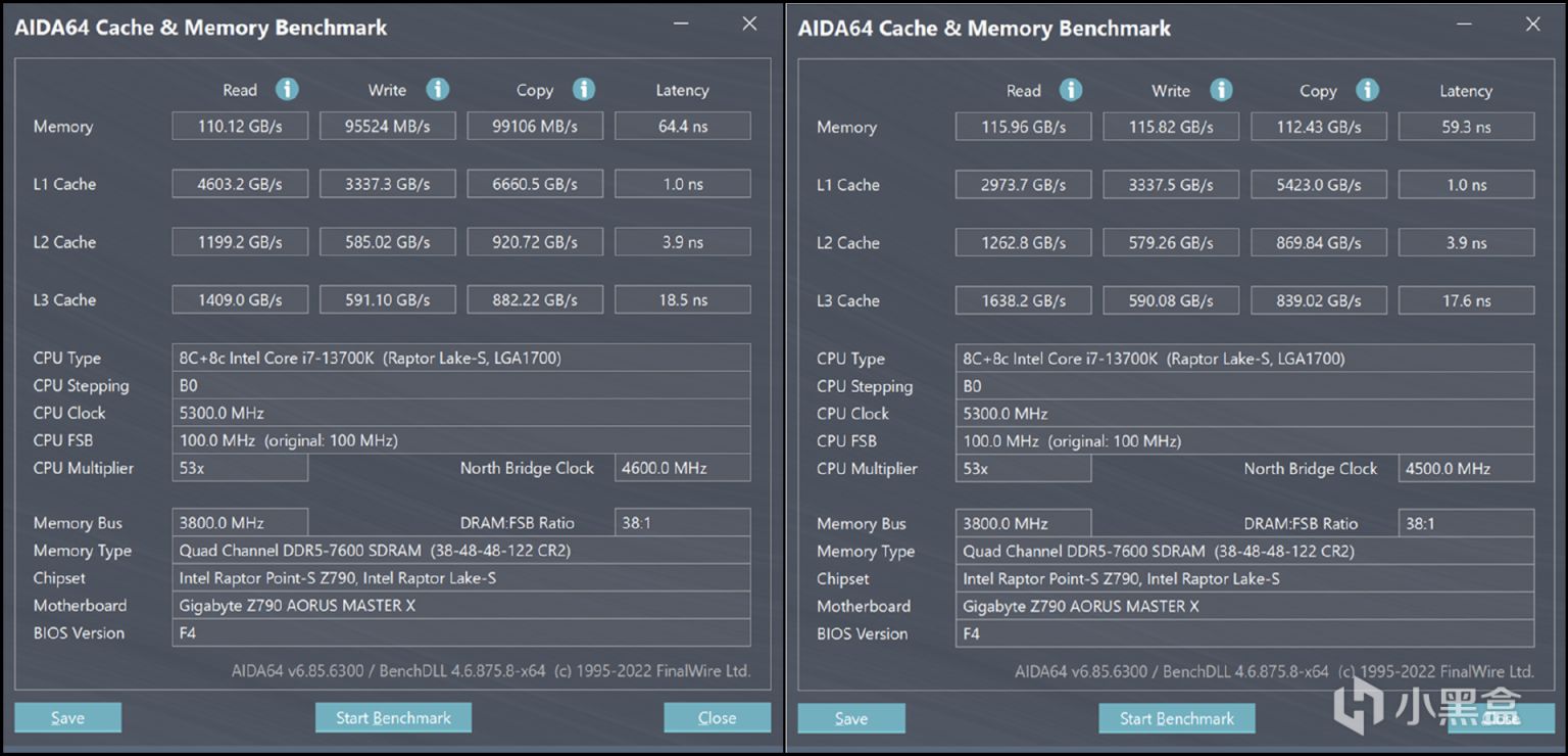 我们先套用技嘉的预设超个7600MHz练练手,这里依然分别对比打开/关闭“高带宽低延迟”模式后的性能表现: