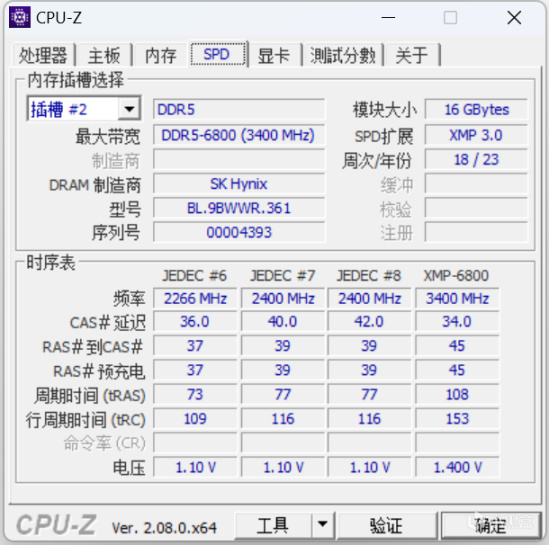 首先看一下CPU-Z读取出的信息,这套宏碁掠夺者Vesta II 炫光星舰 D5 6800内存使用了SK海力士颗粒,原生JEDEC频率为4800MHz,支持XMP自动超频至6800MHz,且XMP后时序为CL34-45-45-108。